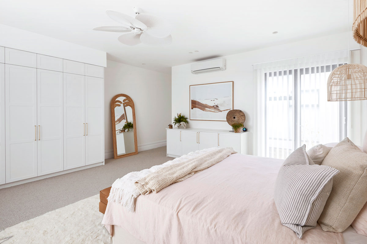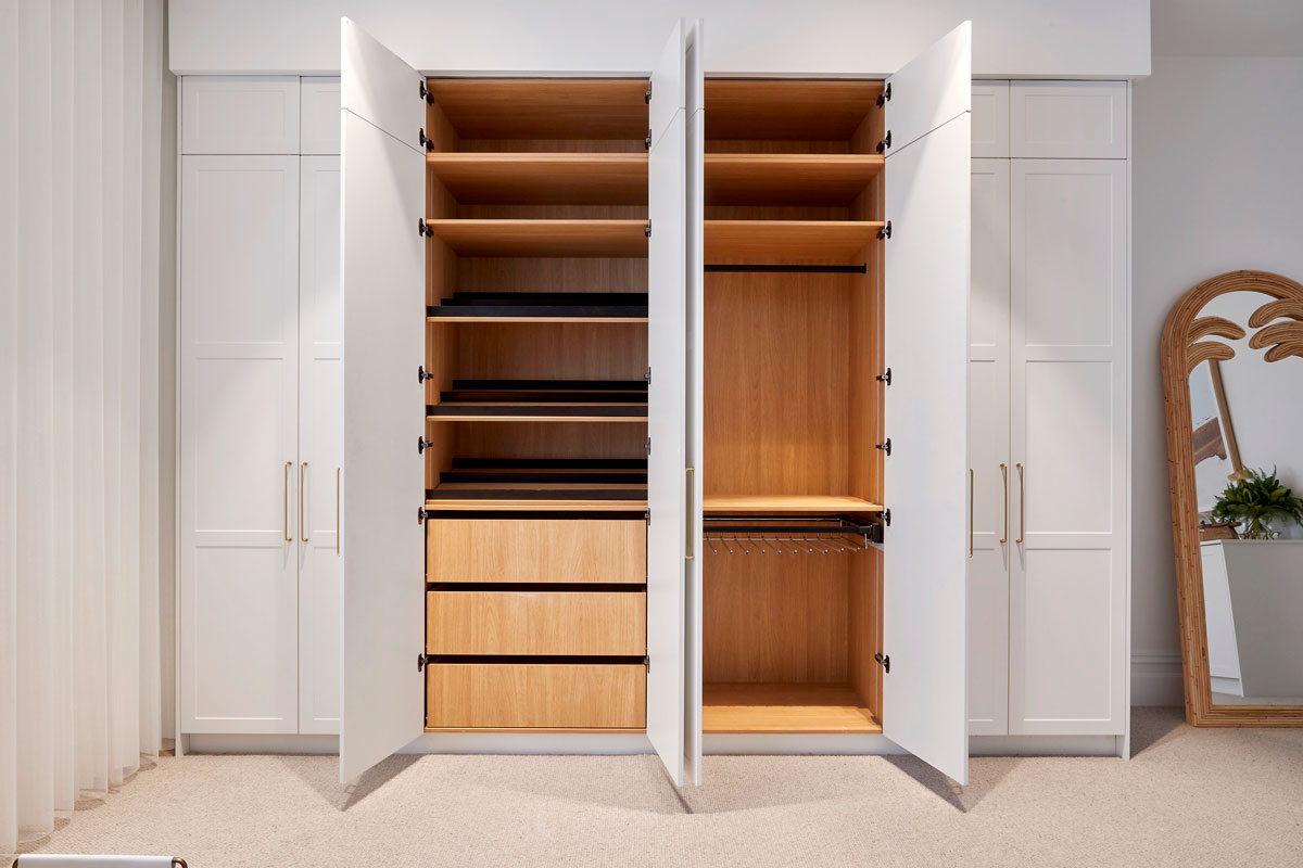 A. Choosing between a Walk-in, Walk-through, Hinged or Sliding wardrobe will depend on the size of your room and the furniture within it. If space permits, a Walk-in robe is the epitome of luxury with the potential to include luxe extras such as island benches, makeup stations or desks. Connect your master bedroom to your ensuite with a Walk-through robe. Hinged wardrobes suit both small and large bedroom spaces and allow you to hide away the contents of your robe behind closed doors. Sliding robes are a great option for smaller spaces, as they allow you to place bedroom furniture such as bedside tables and tall boys closer to your robe as you don’t need to factor in hinged doors opening out into your bedroom.