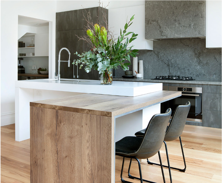 - Josh and Elyse’s winning kitchen from 2017 featured matching splashback and island benchtop in beautiful Noble Grey