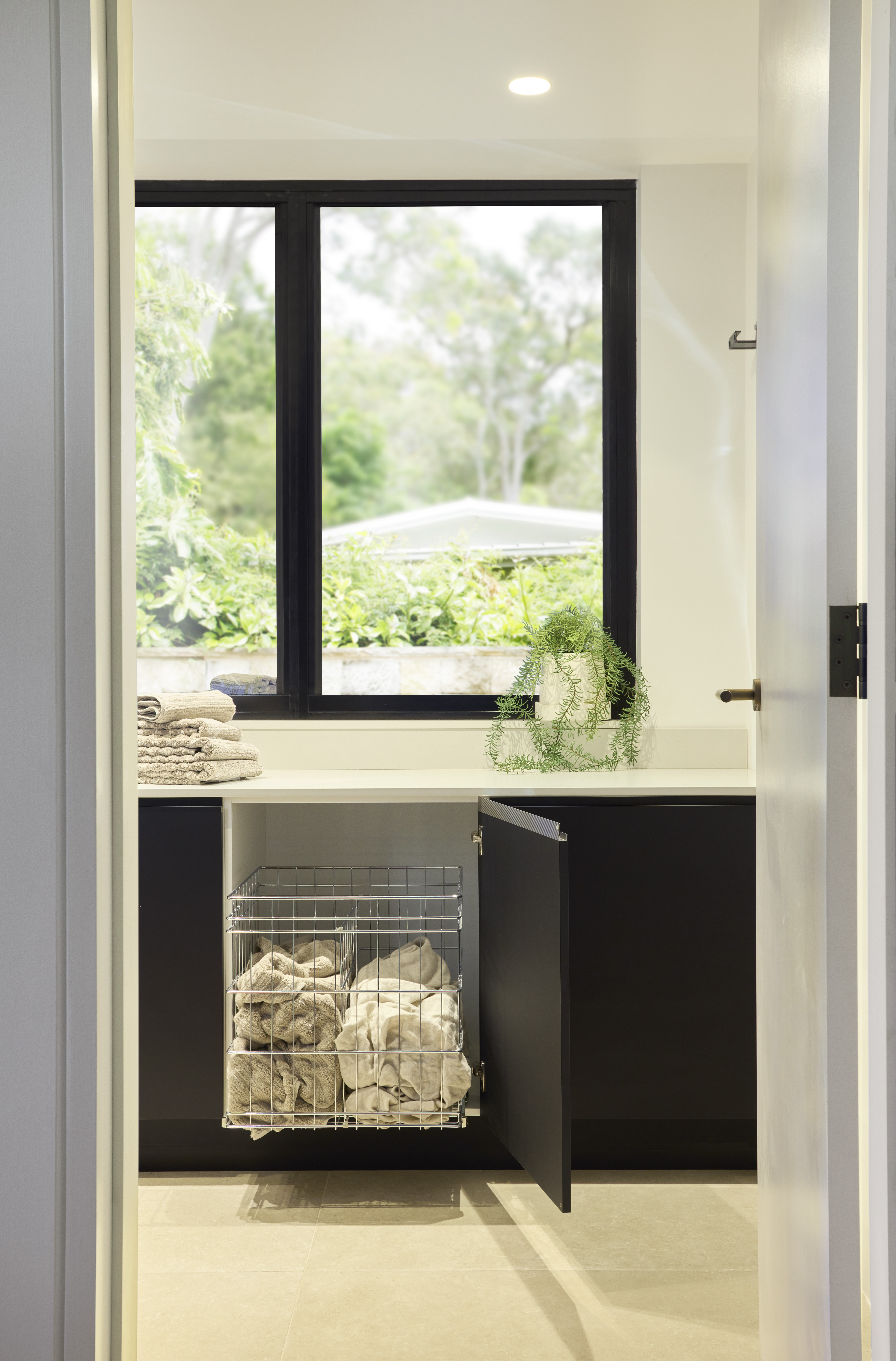The narrow, galley-shaped laundry room is designed for a sleek, functional look that maximises storage. Alsakan Black Ultramatt kitchen cabinets with integrated Peak handles feature again, this time paired with a soft white Dekton Laguna benchtop, creating a chic monochromatic palette.