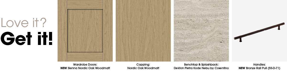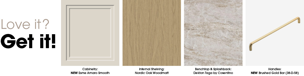 The space also includes a dedicated pet bed zone in Savannah Clay Natural cabinetry. The curved design of the pet bed immediately caught the judges’ attention, with Shaynna exclaiming, “Oh how cute, a little doggy area!” Marty also praised the subtle pink undertones of the new Savannah Clay Natural joinery. “I really like the colour and the choice of cushion- this works beautifully and delivers the storage you need.”