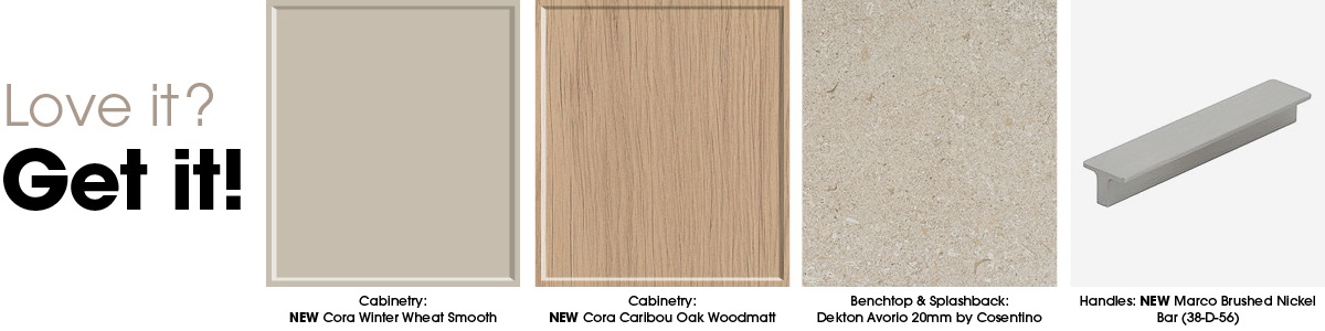 - Cabinetry: NEW Cora Winter Wheat Smooth, NEW Cora Caribou Oak Woodmatt