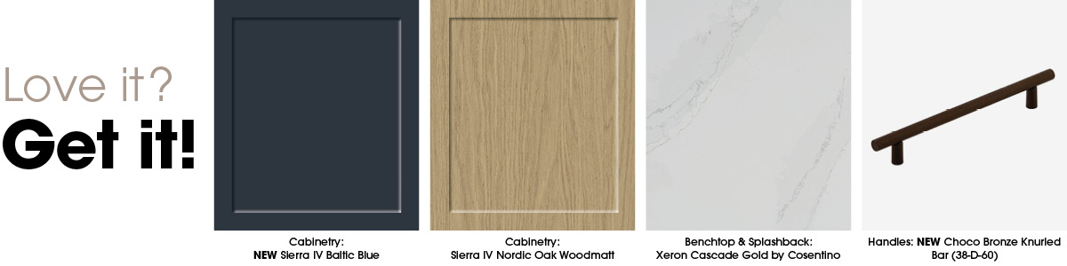 - Cabinetry: Sierra IV NEW Baltic Blue, Sierra IV in Nordic Oak Woodmatt (laundry/pantry), Newbury Savannah Clay Natural (mudroom)