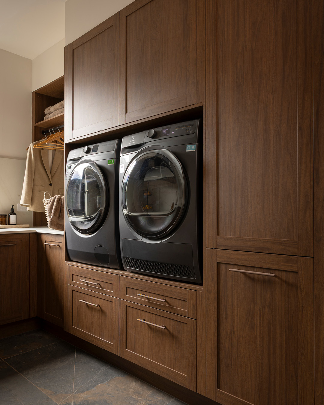 - Accessories: Häfele Black Hanging Rail, Häfele Ninka Bins, Laundry Wire Baskets, Elevated Washer & Dryer