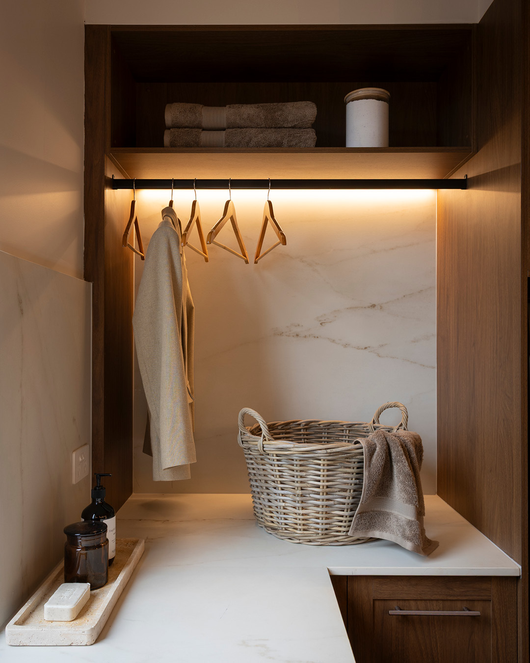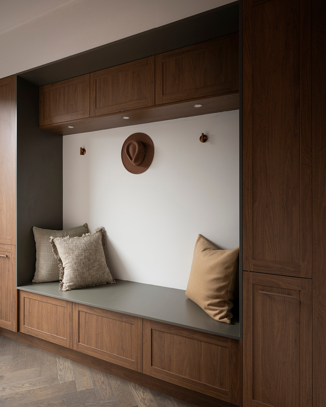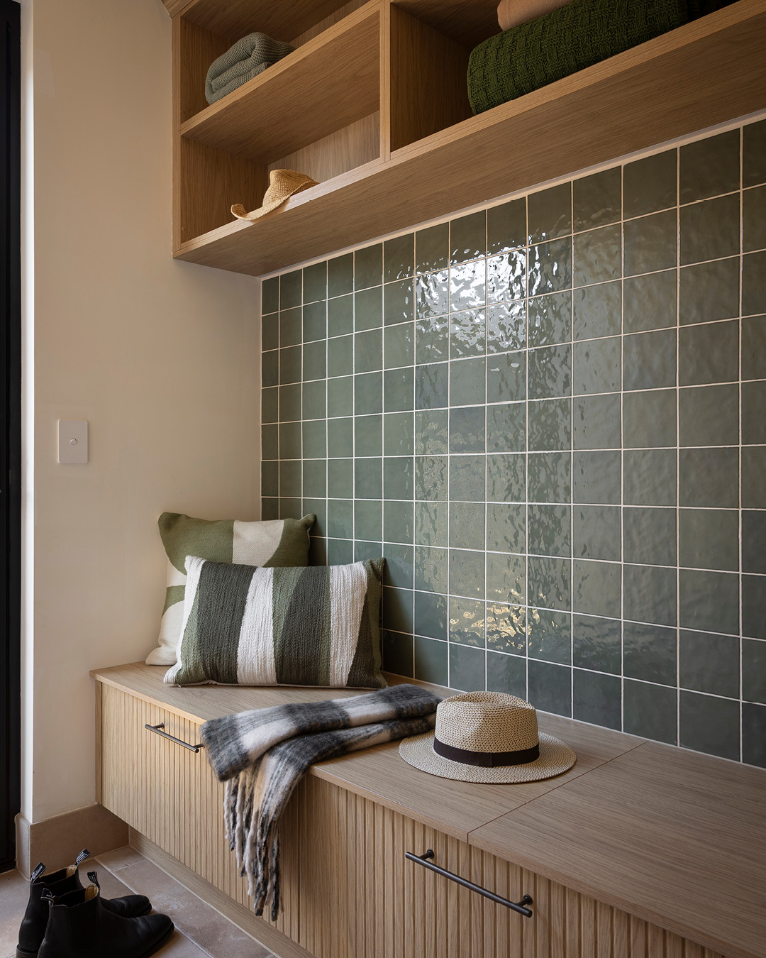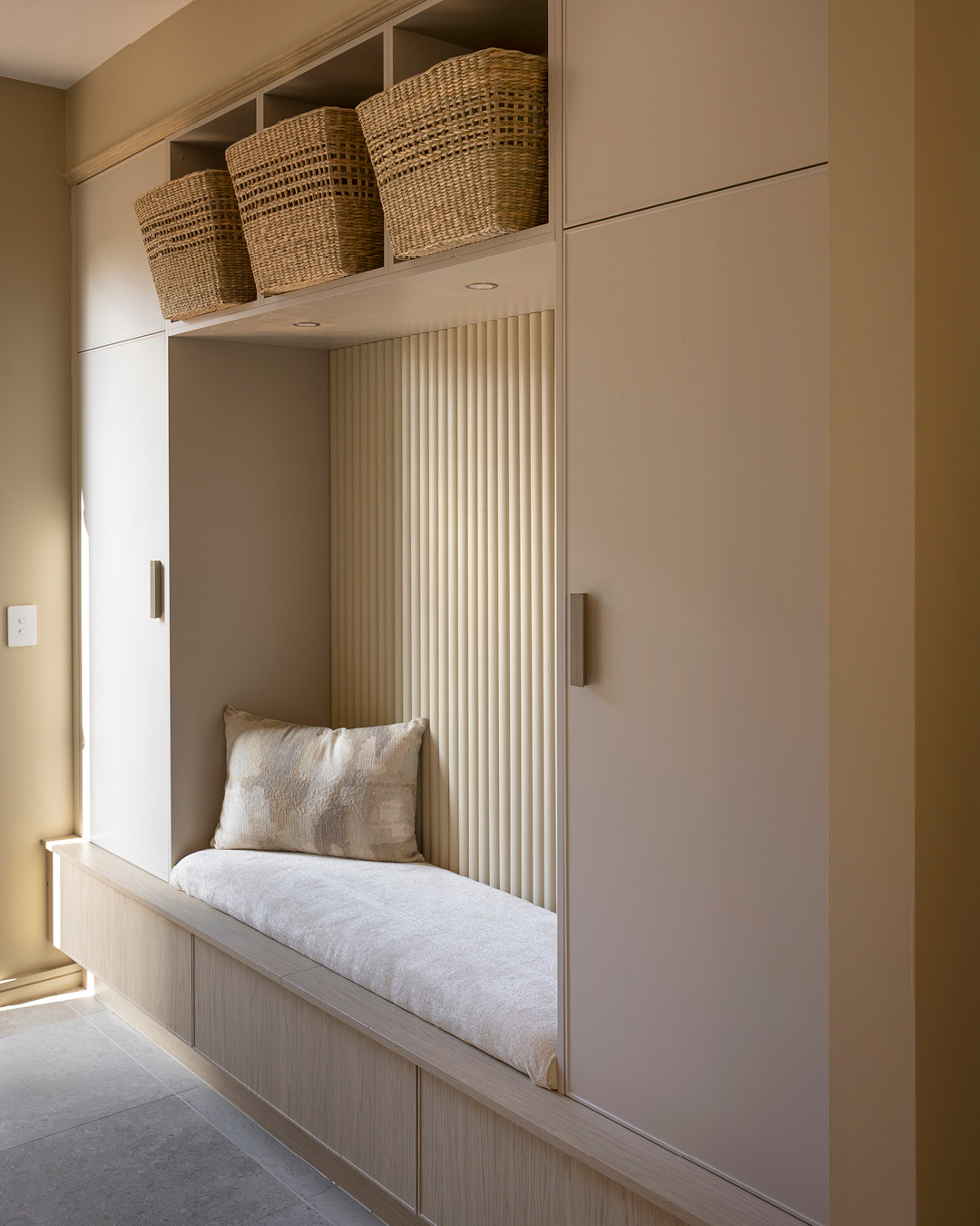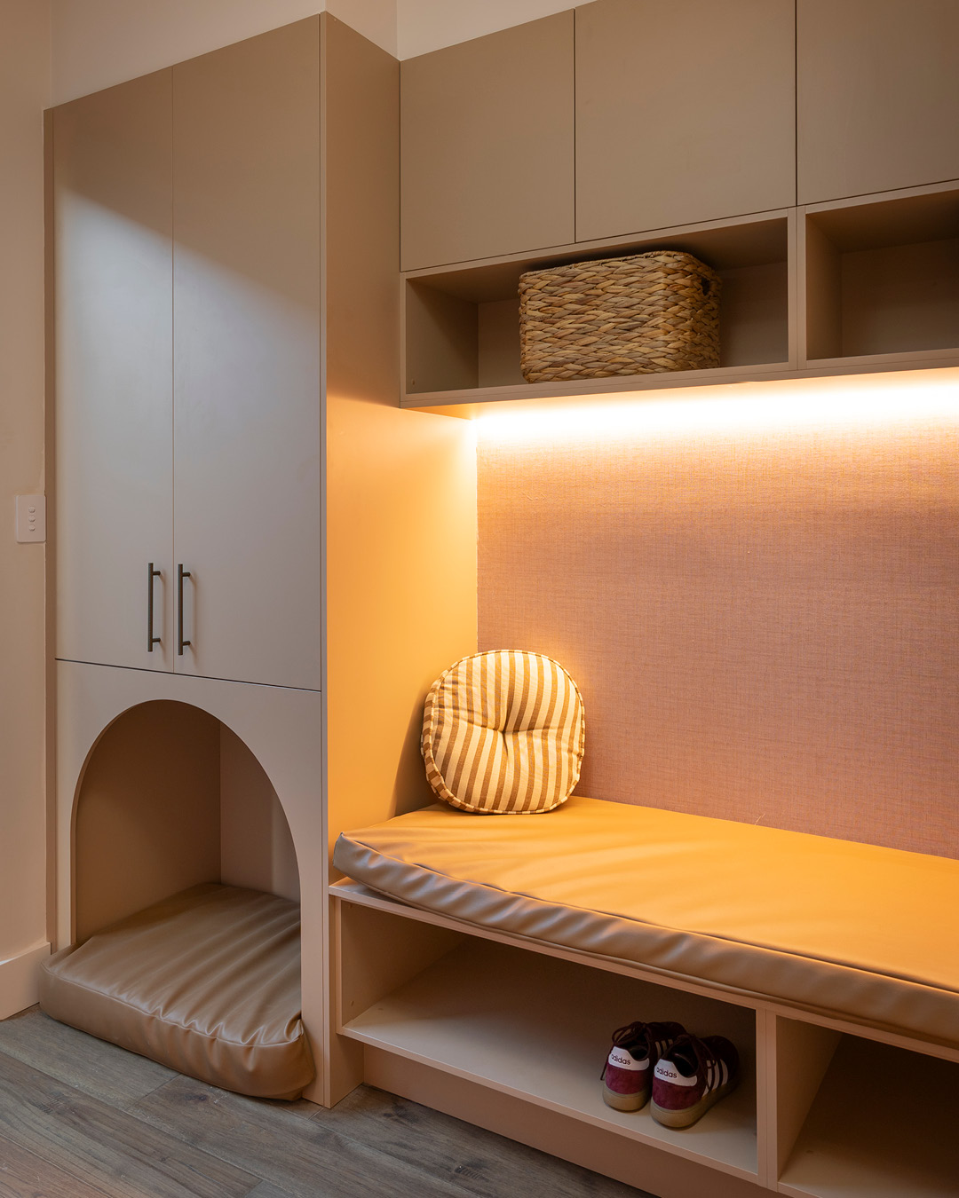The mudroom strikes the perfect balance between comfort and practicality, featuring built-in storage and a bench seat softened with a custom cushion. Open shelving beneath the bench provides easy shoe storage, while Häfele LED lighting adds a functional glow.