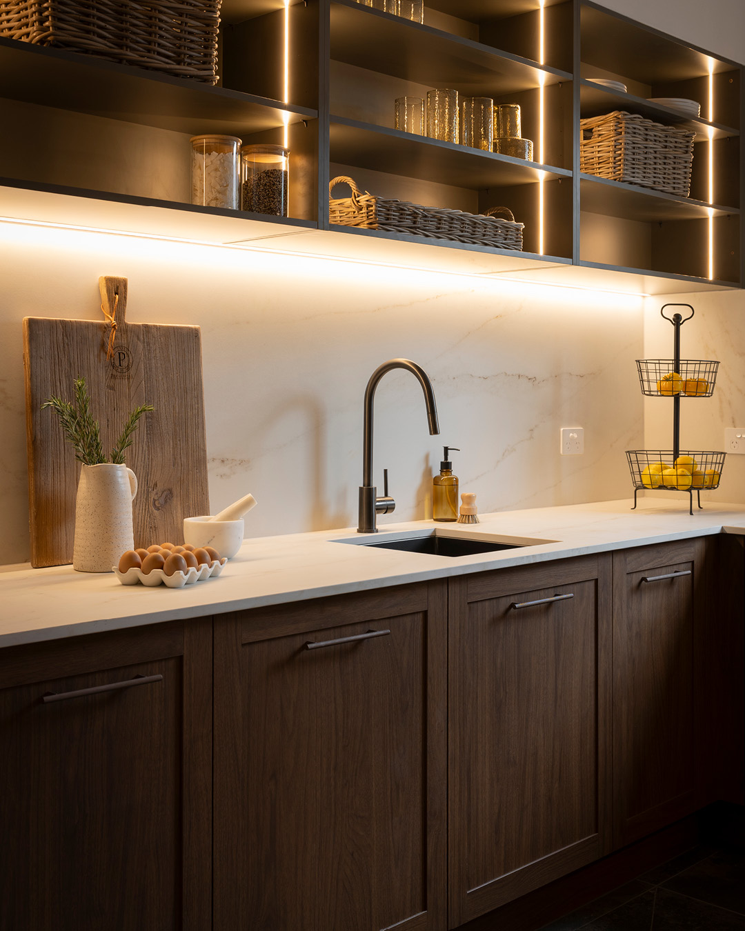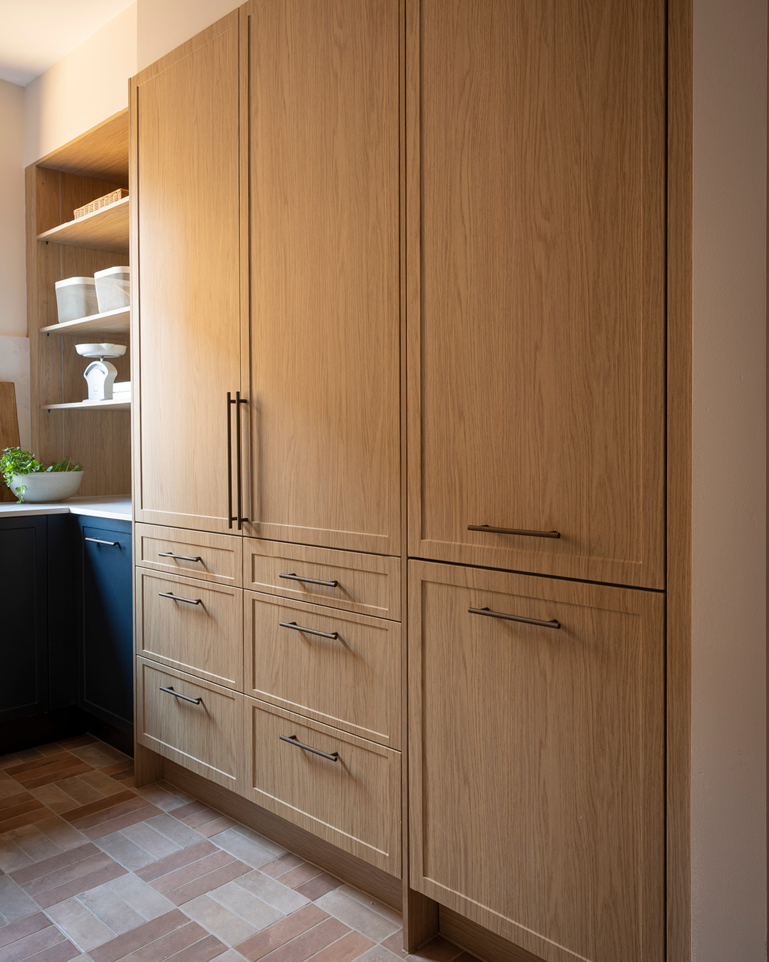 Organisation and pantry storage is enhanced with Hettich drawers, cutlery trays, and non-slip mats, alongside a Häfele sink and tap in Gun Metal. The result is a warm, textural space that feels both functional and stylish and is brimming with pantry ideas.