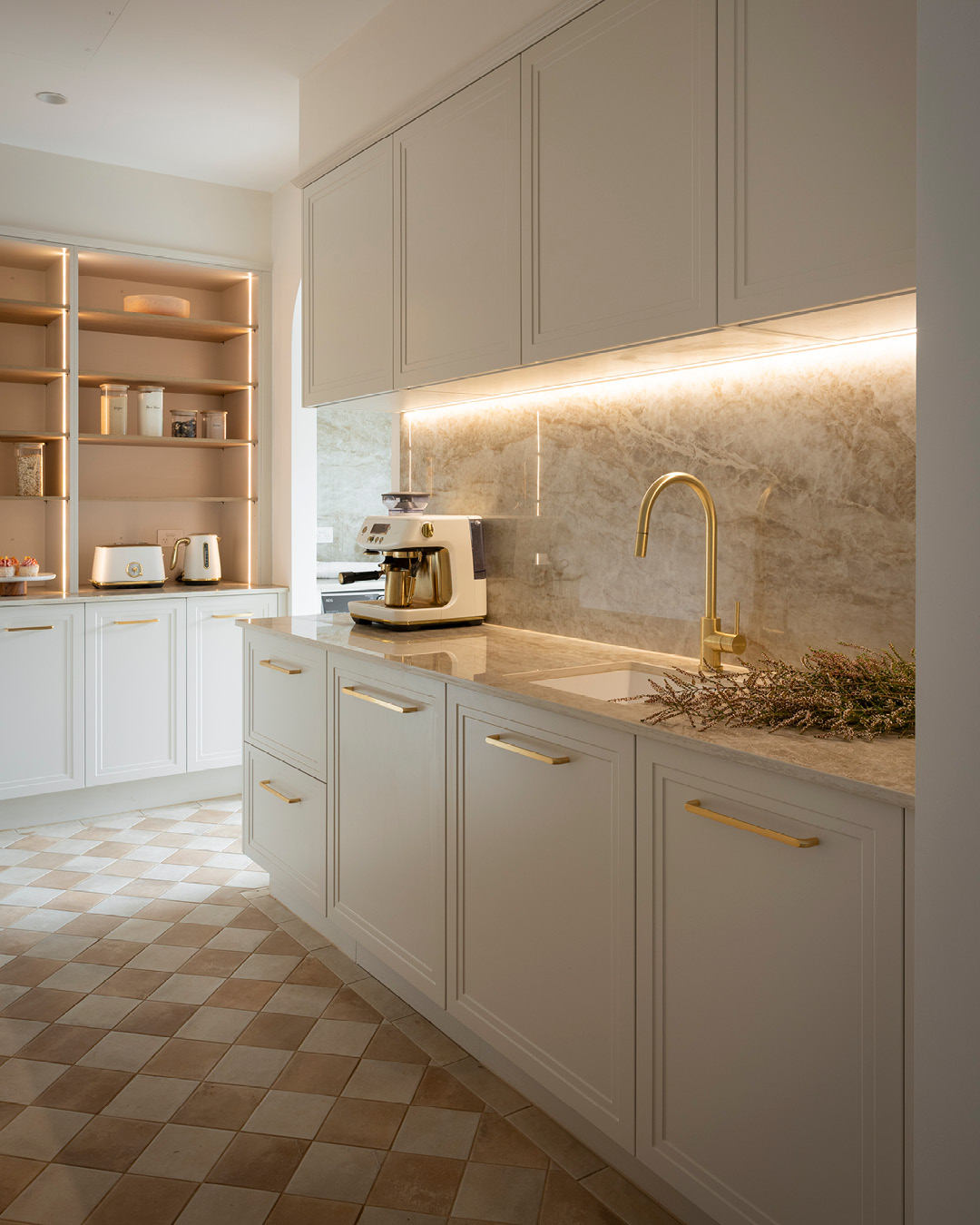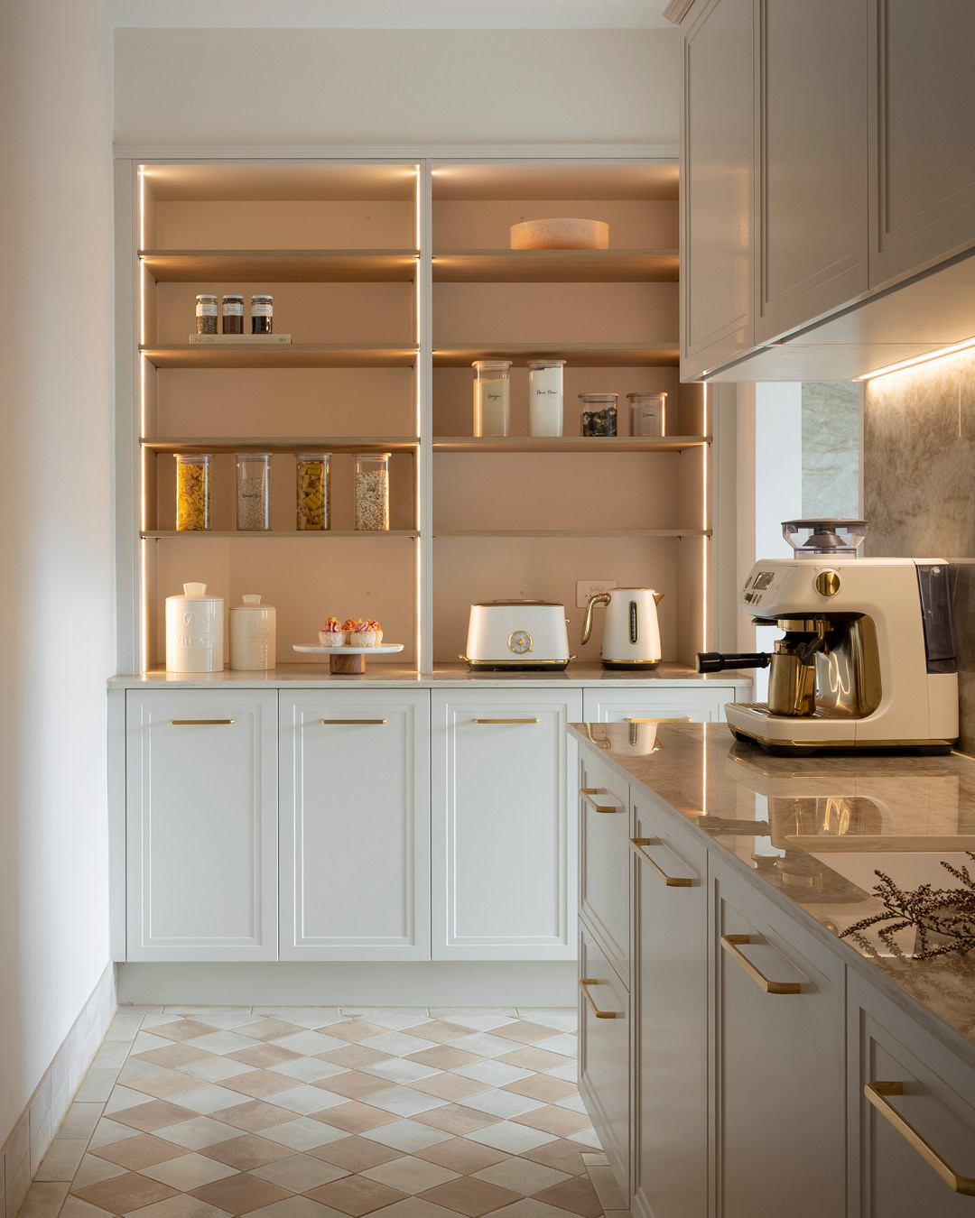 Organisation is maximised with Hettich AvanTech YOU drawers, spice trays, and non-slip mats, while a white Häfele quartz sink and gold goose neck tap add a refined finish. LED strip and Flexi lighting highlight the decorative cabinetry, ensuring the space feels both practical and polished.