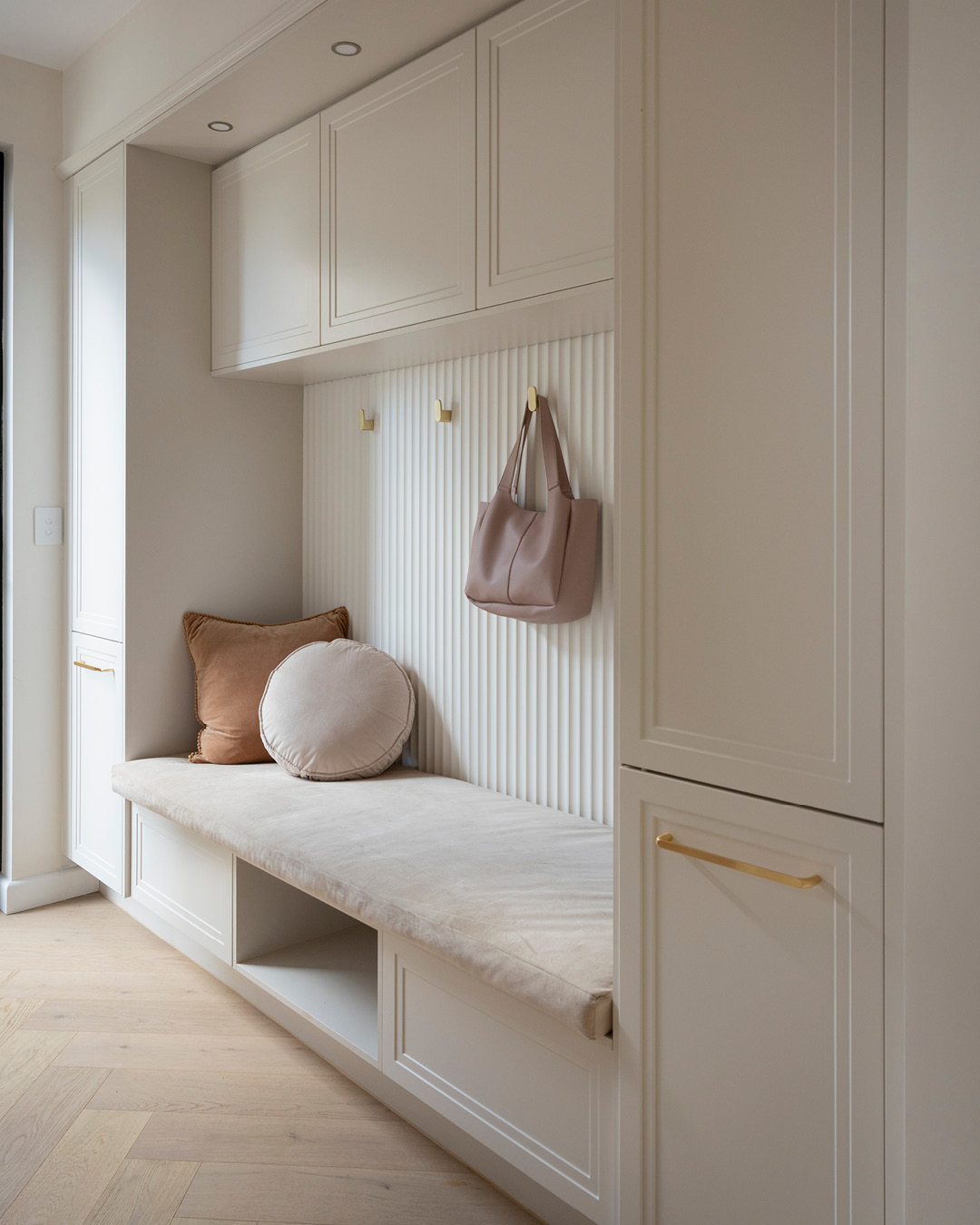 The mudroom is square in layout, offering both seating and tall cabinetry in a brilliant mudroom storage solution that keeps clutter hidden. Esme Amaro Smooth cabinetry, Brushed Gold handles, and a custom cushion bring warmth and comfort, while Häfele LED downlights make the space practical for daily use.