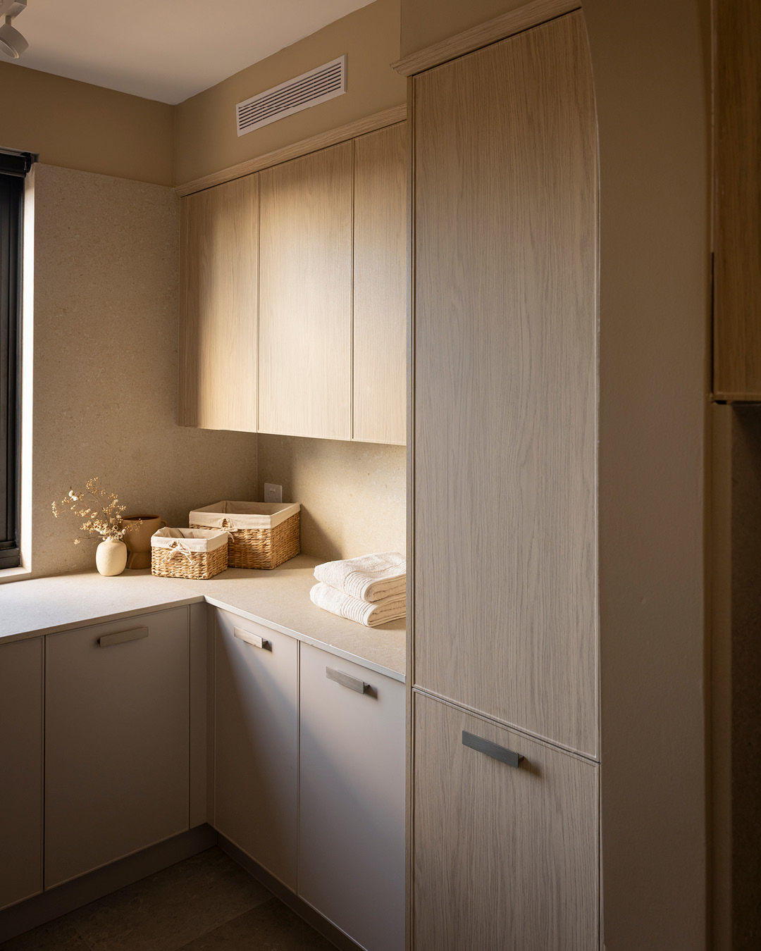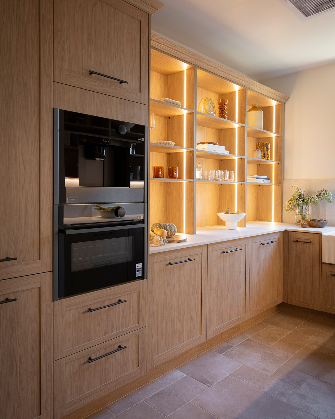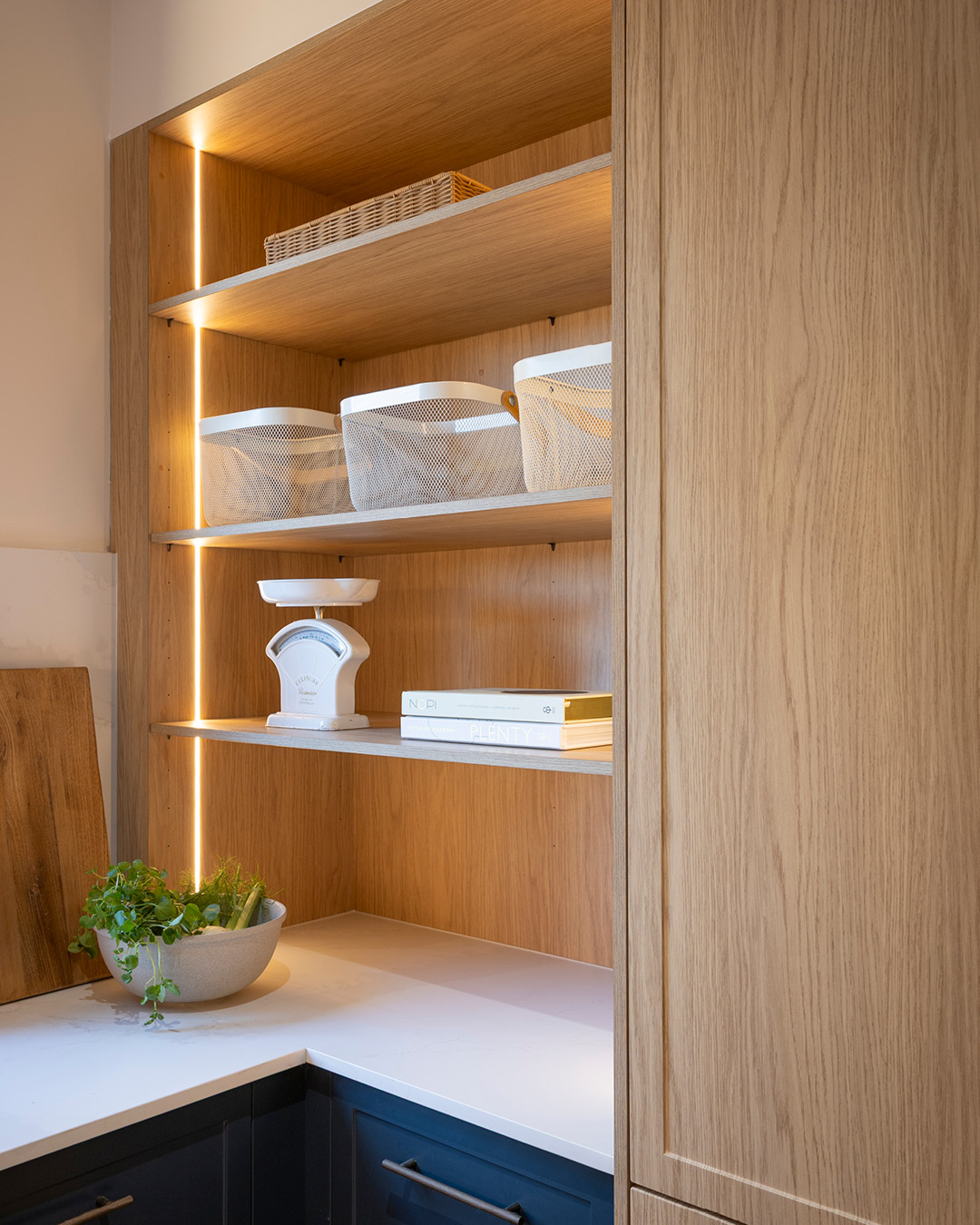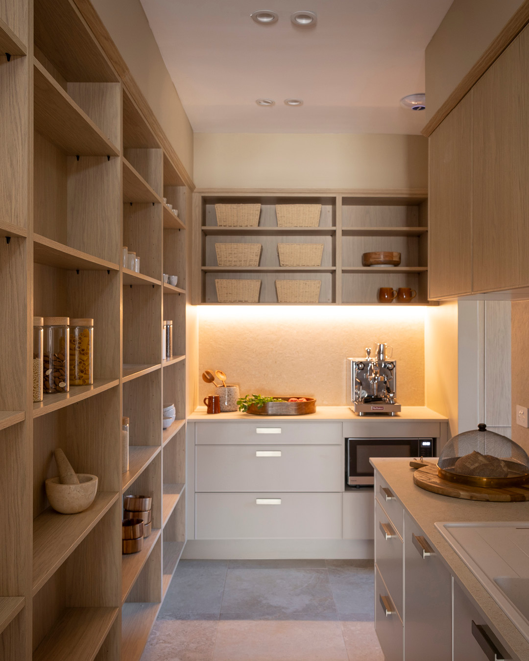 Robby and Mat’s walk-in pantry is both practical and refined, pairing our new Sienna Shaker-style kitchen cupboards in Nordic Oak Woodmatt with Dekton Pietra Kode Nebu surfaces. The mix of open shelving and closed cupboards balance display and storage, illuminated with LED strip lighting.