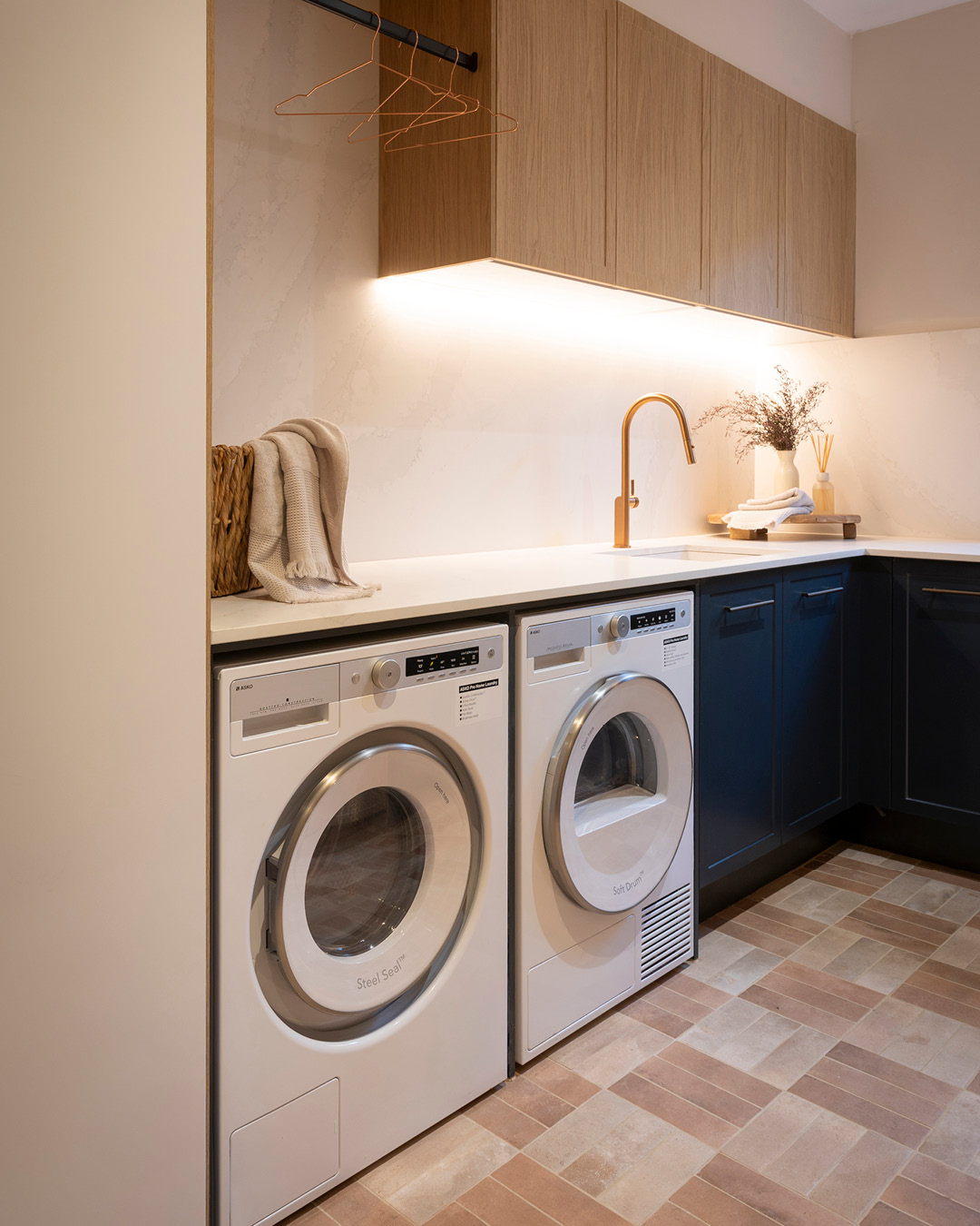 Sonny and Alicia cleverly combined their pantry and laundry into one multifunctional zone. Baltic Blue shaker-style cabinetry which featured heavily in their main kitchen has been used sparingly alongside Nordic Oak Woodmatt, allowing the oak to define the space. Xeron Cascade Gold benchtops by Cosentino bring durability and elegance, finished with Choco Bronze Knurled Bar handles.“Sonny and Alicia always do beautiful textures,” smiled Shaynna. “We have the beautiful flooring, the beautiful cabinetry, gorgeous handles and then these taps!”