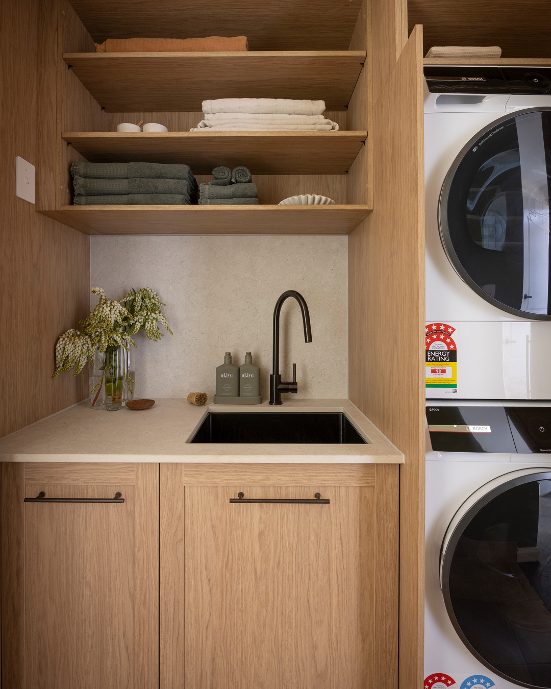 Emma and Ben combined their laundry design and pantry into one cohesive, multifunctional space which maximises function and storage with Häfele inclusions such as a linen-finish sinks, Gun Metal goose neck taps, Ninka bins, laundry baskets, and a black hanging rail, which Darren said was placed in the perfect spot in what would otherwise be a dead corner.
