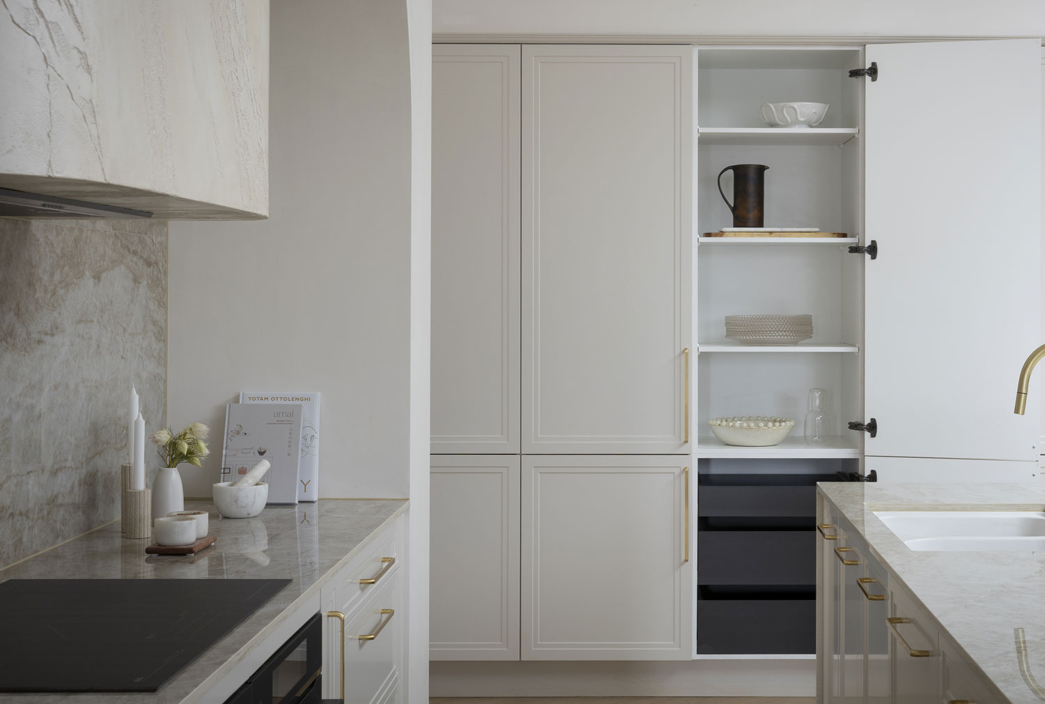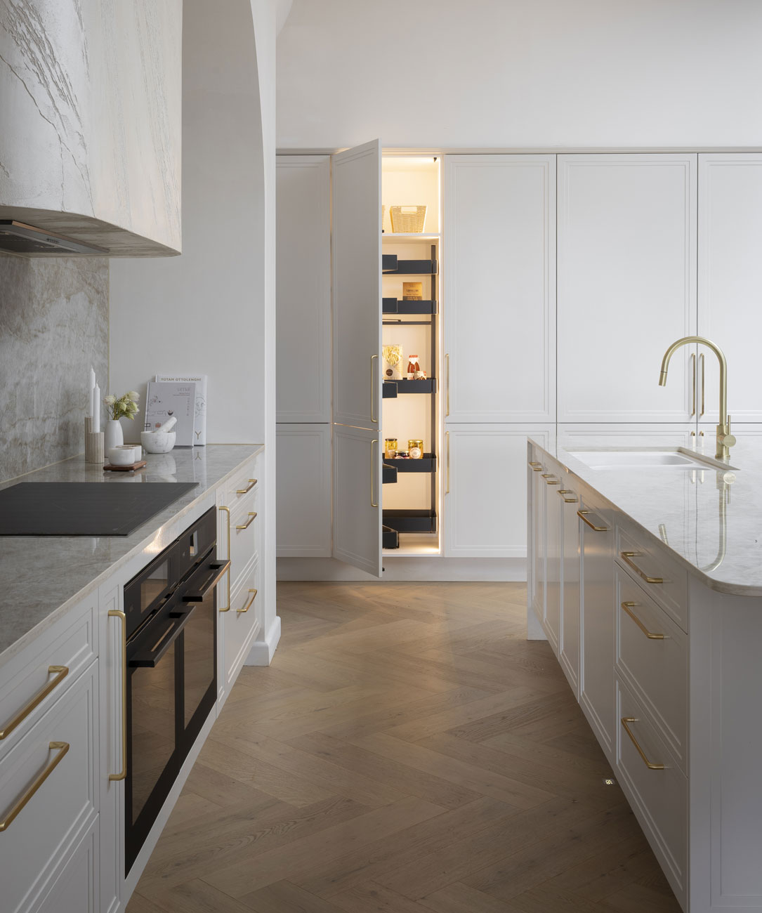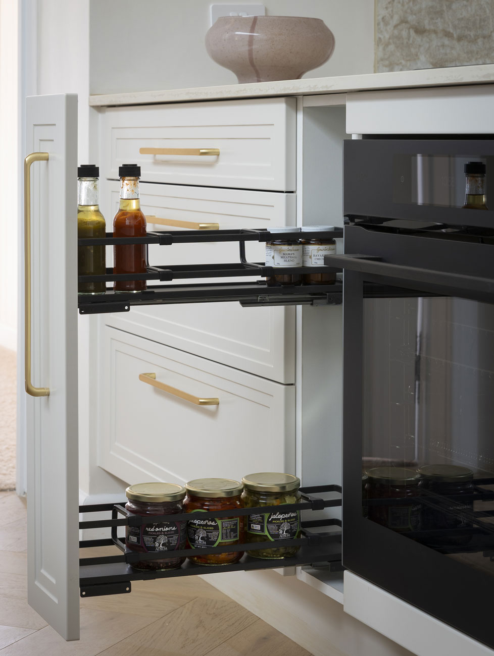 The kitchen cabinets combine our new Esme profile in Amaro Smooth with Nordic Oak interiors in the pantry cupboard, accented by Brushed Gold Bar handles. Functionality is elevated with kitchen storage inclusions such as Hettich AvanTech YOU drawers with Side Illumination, Cutlery Trays, Non-slip Mats, alongside the Häfele Tandem Side pantry. Flexi LED lighting ensures the warm Nordic Oak tones are beautifully highlighted.