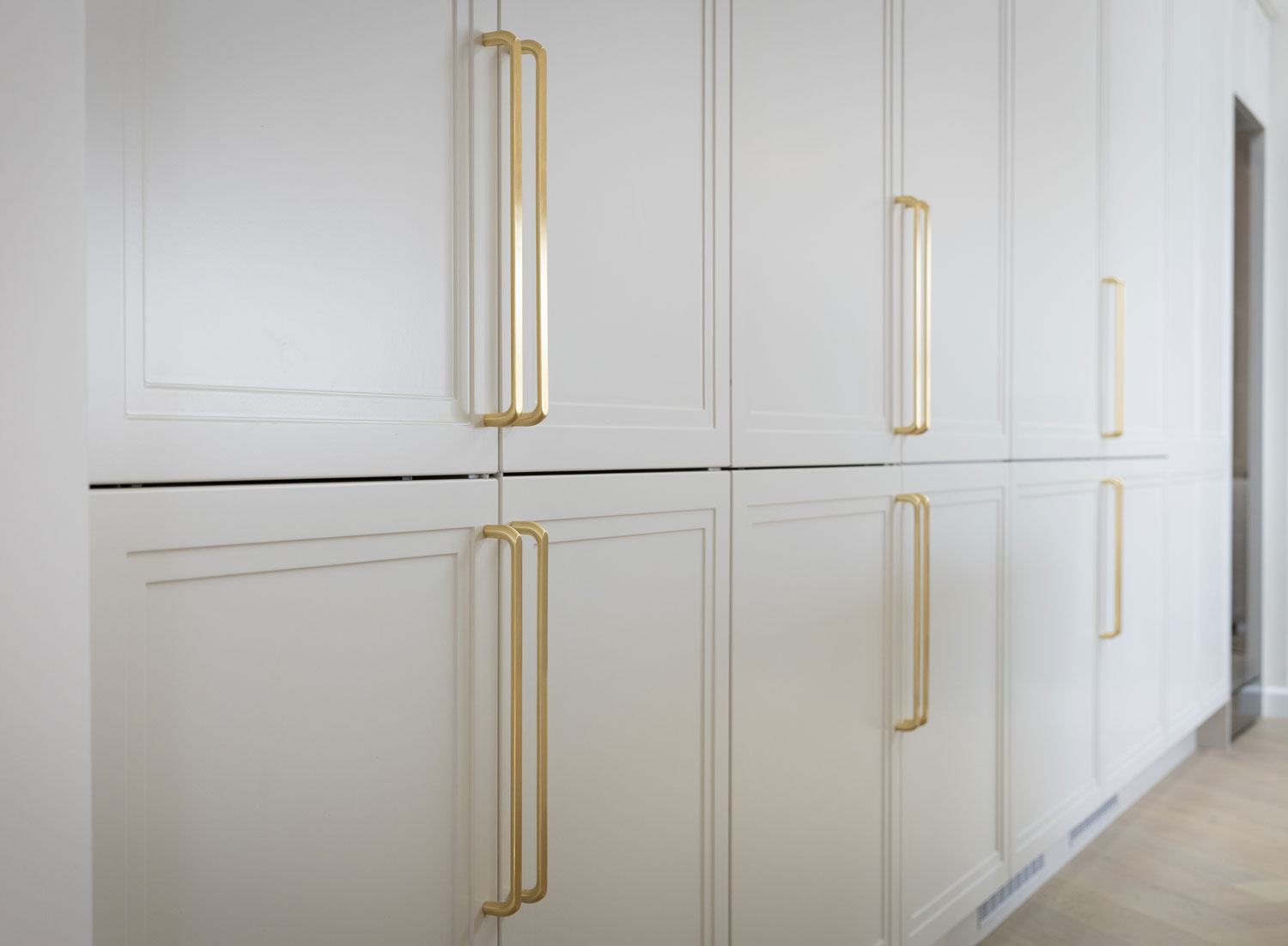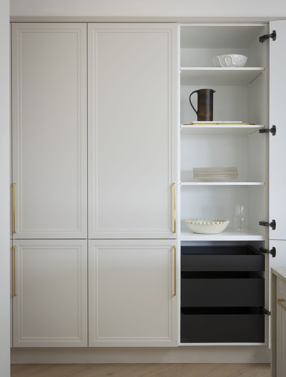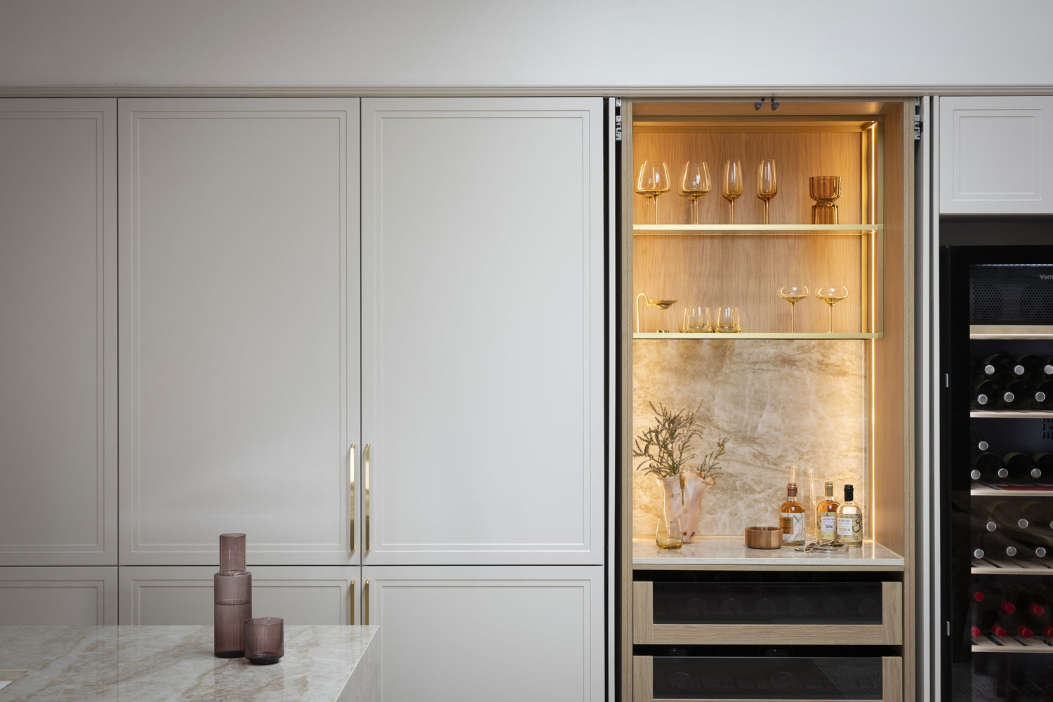 The kitchen cabinets combine our new Esme profile in Amaro Smooth with Nordic Oak interiors in the pantry cupboard, accented by Brushed Gold Bar handles. Functionality is elevated with kitchen storage inclusions such as Hettich AvanTech YOU drawers with Side Illumination, Cutlery Trays, Non-slip Mats, alongside the Häfele Tandem Side pantry. Flexi LED lighting ensures the warm Nordic Oak tones are beautifully highlighted.