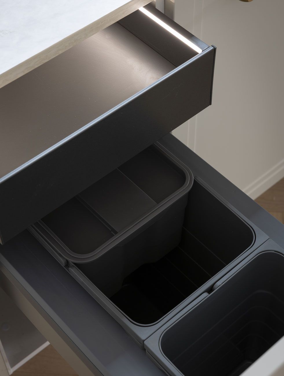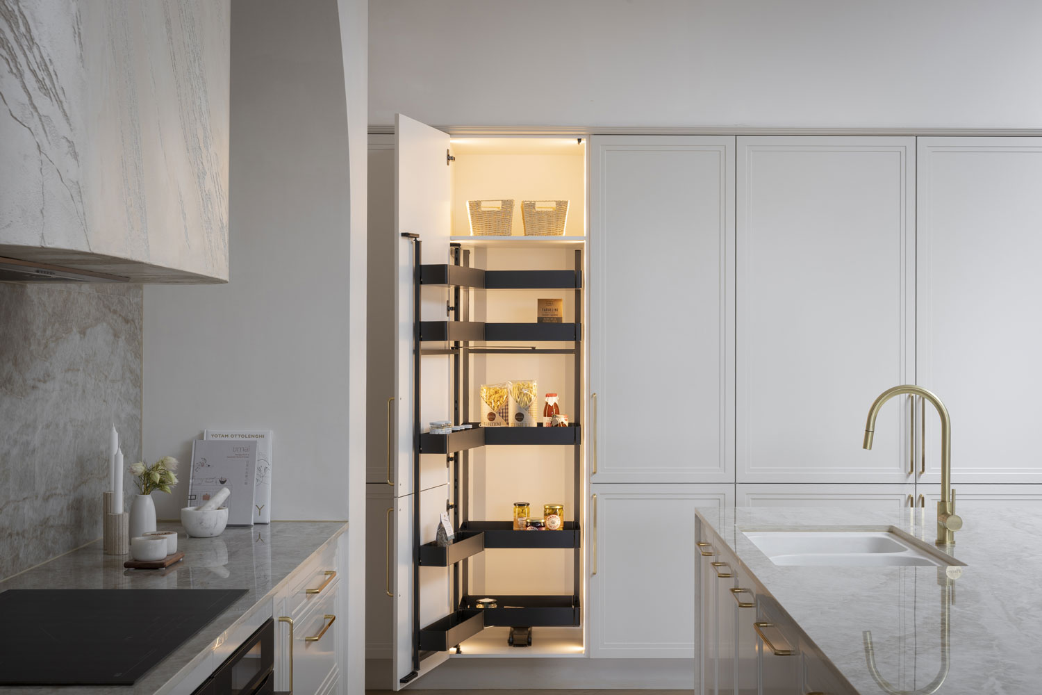 Accessories: NEW Hettich AvanTech YOU Drawers with Side Illumination, NEW Hettich Cutlery Trays with Knife Block and Foil Compartments, NEW Hettich Non-slip Matts, Häfele Tandem Side (to Broom Pantry), Häfele Ninka Bins