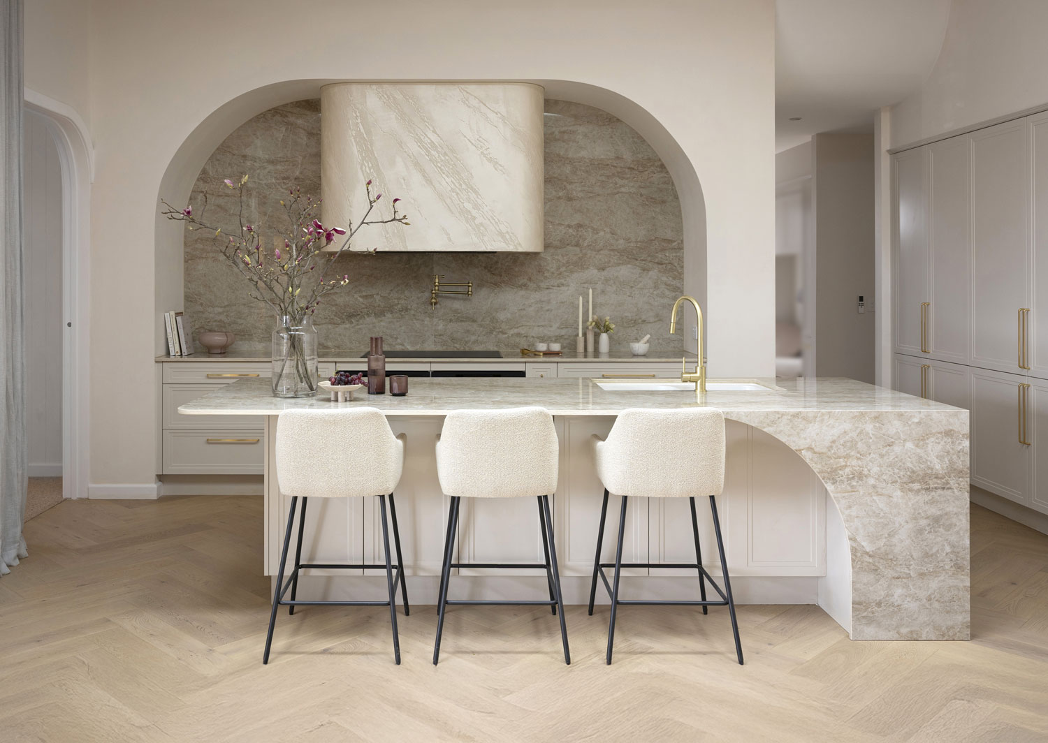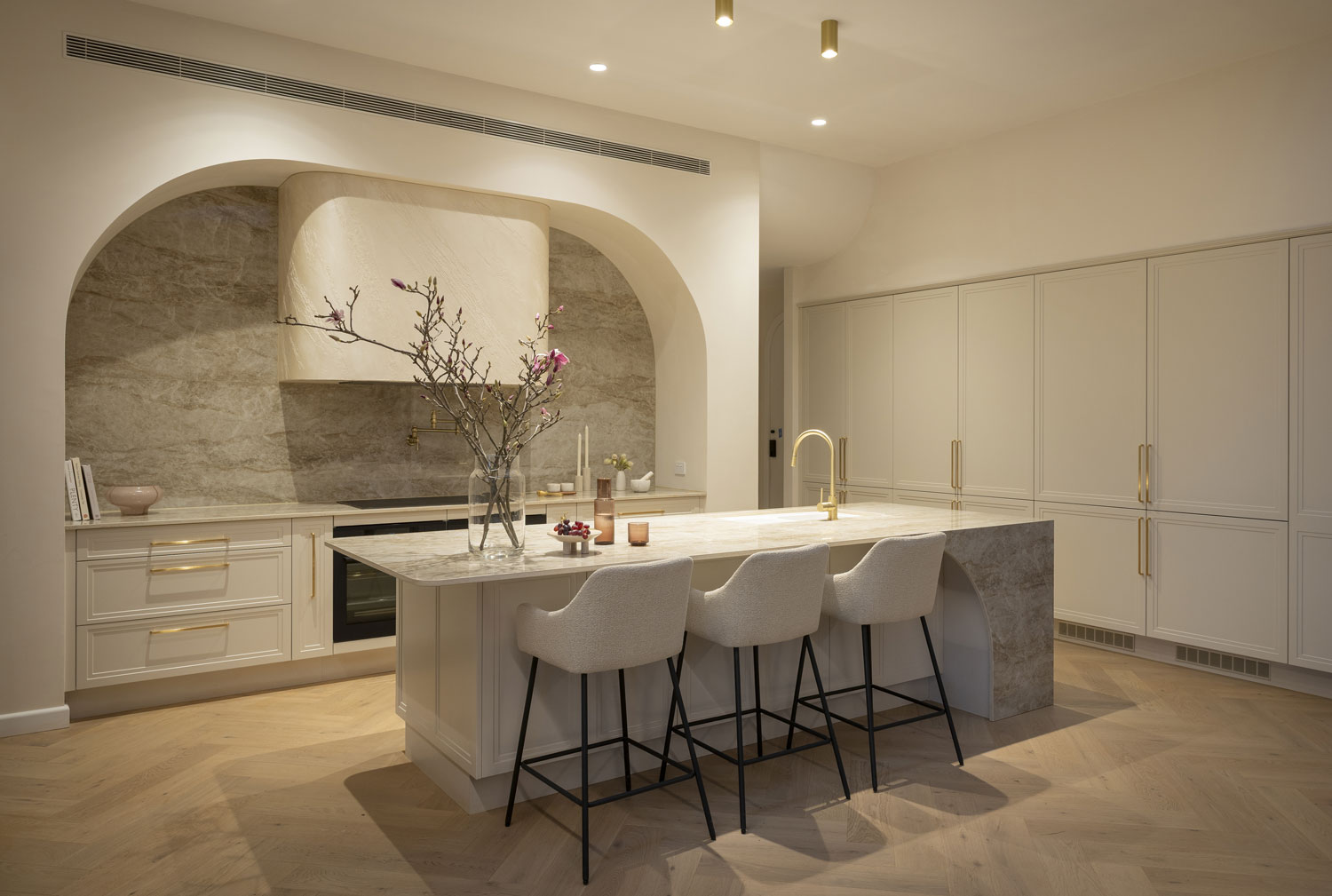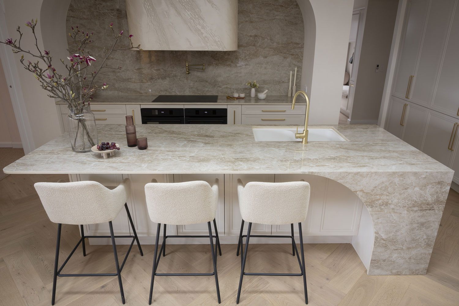 Han and Can’s kitchen design is a modern and elegant space defined by soft curves and a refined material palette that flows seamlessly through their home. The Dekton Taga kitchen island bench by Cosentino with a curved waterfall end creates a striking centrepiece, with curves continuing through the splashback and bulkhead, bringing a sense of softness that balances the clean lines of the contemporary joinery.