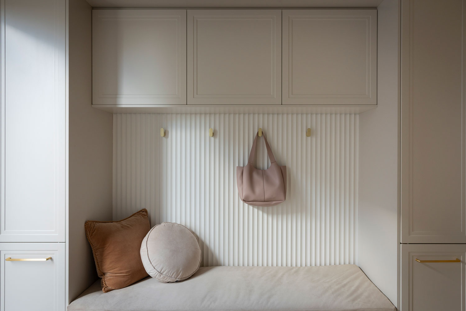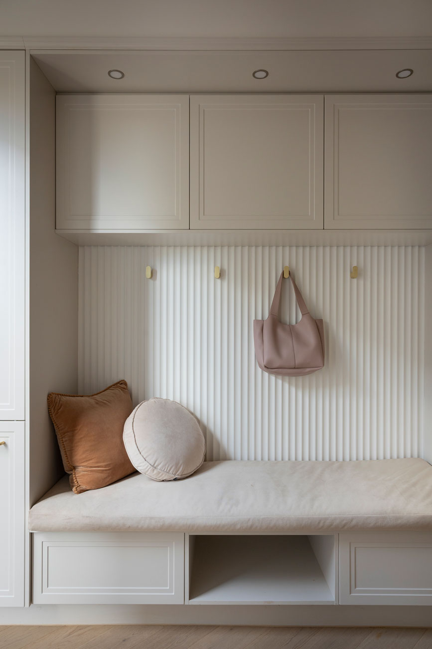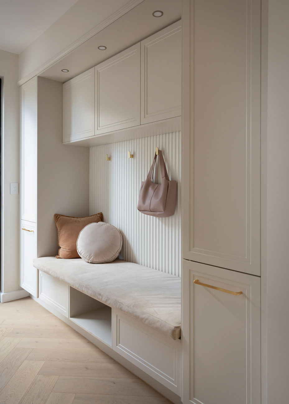 Han and Can’s square-shaped mudroom provides a practical and stylish addition to House 2. Designed for everyday use, it offers space to remove shoes, boots and jackets before entering the home. The layout incorporates tall cabinetry with both shelving and hanging space, ensuring the area is highly functional for family living.