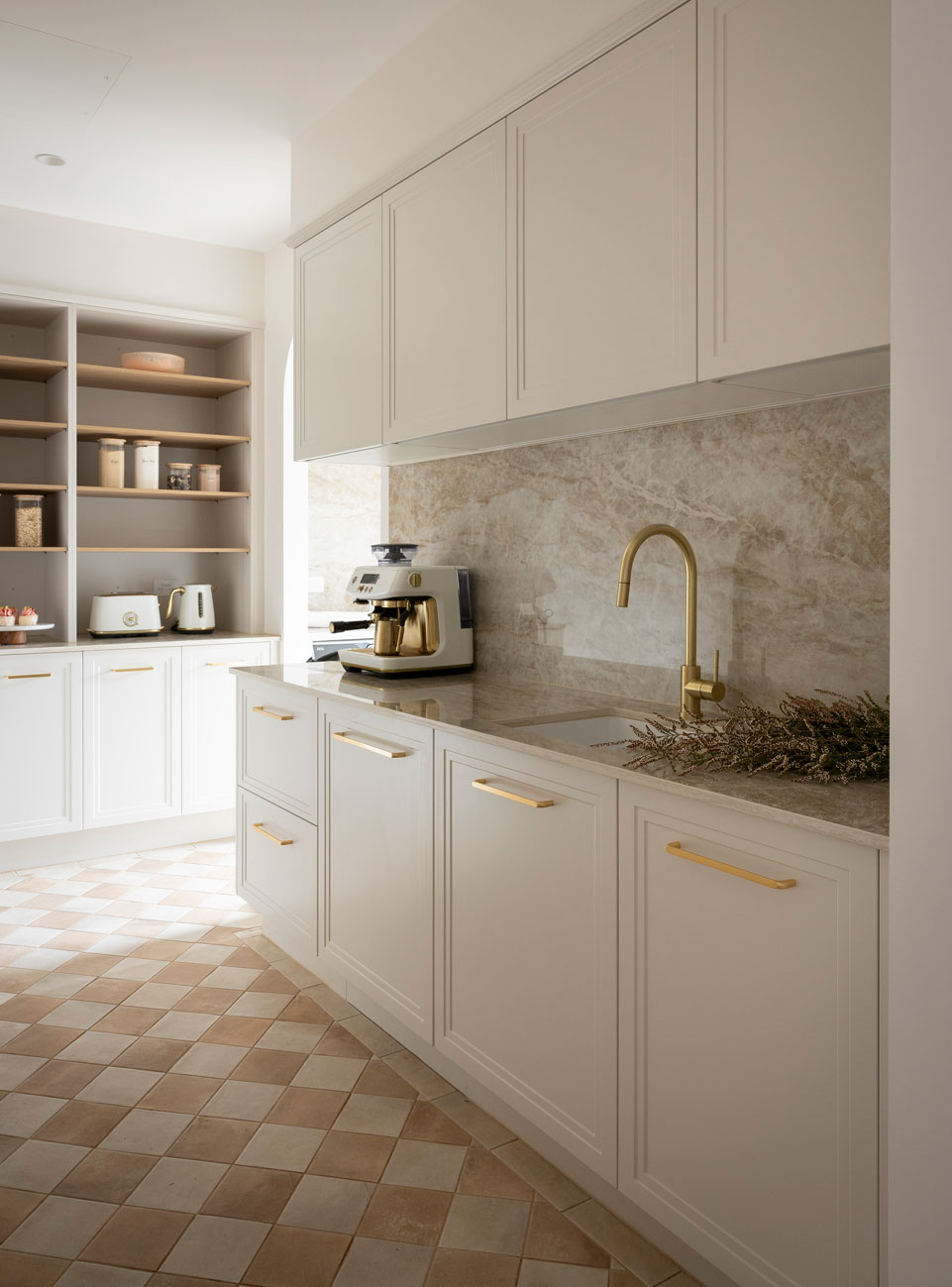 Han and Can created a glamorous yet functional pantry that continues the look of their statement kitchen. Designed with two distinct zones- one for storage and display, and another for food preparation and cleaning- the space balances everyday usability with a refined finish. The warm palette is created with Esme Amaro Smooth cabinetry, Nordic Oak Woodmatt shelving, and Touch Brushed Gold handles, all paired with Dekton Taga by Cosentino.