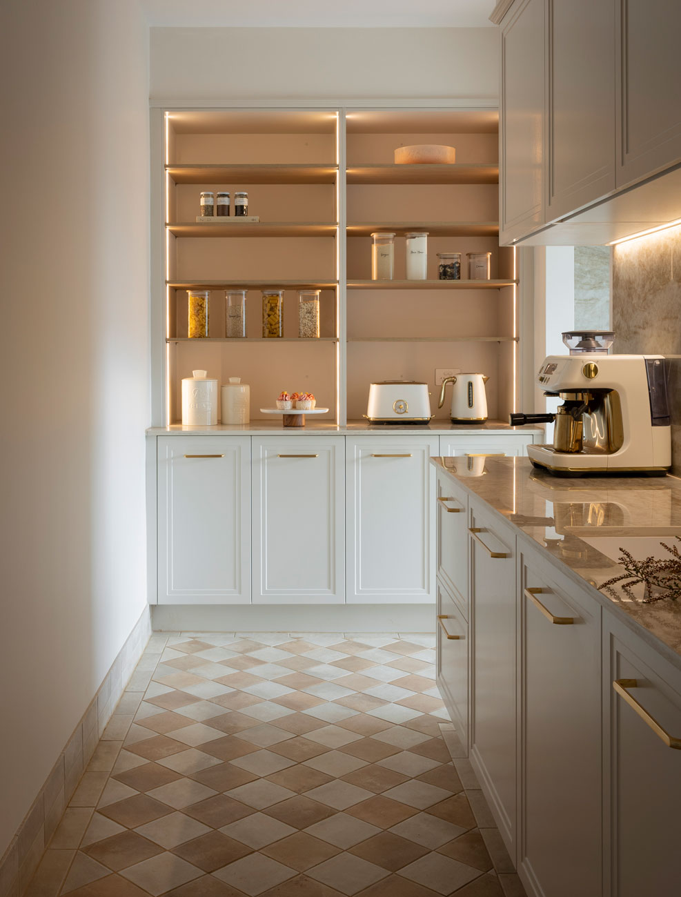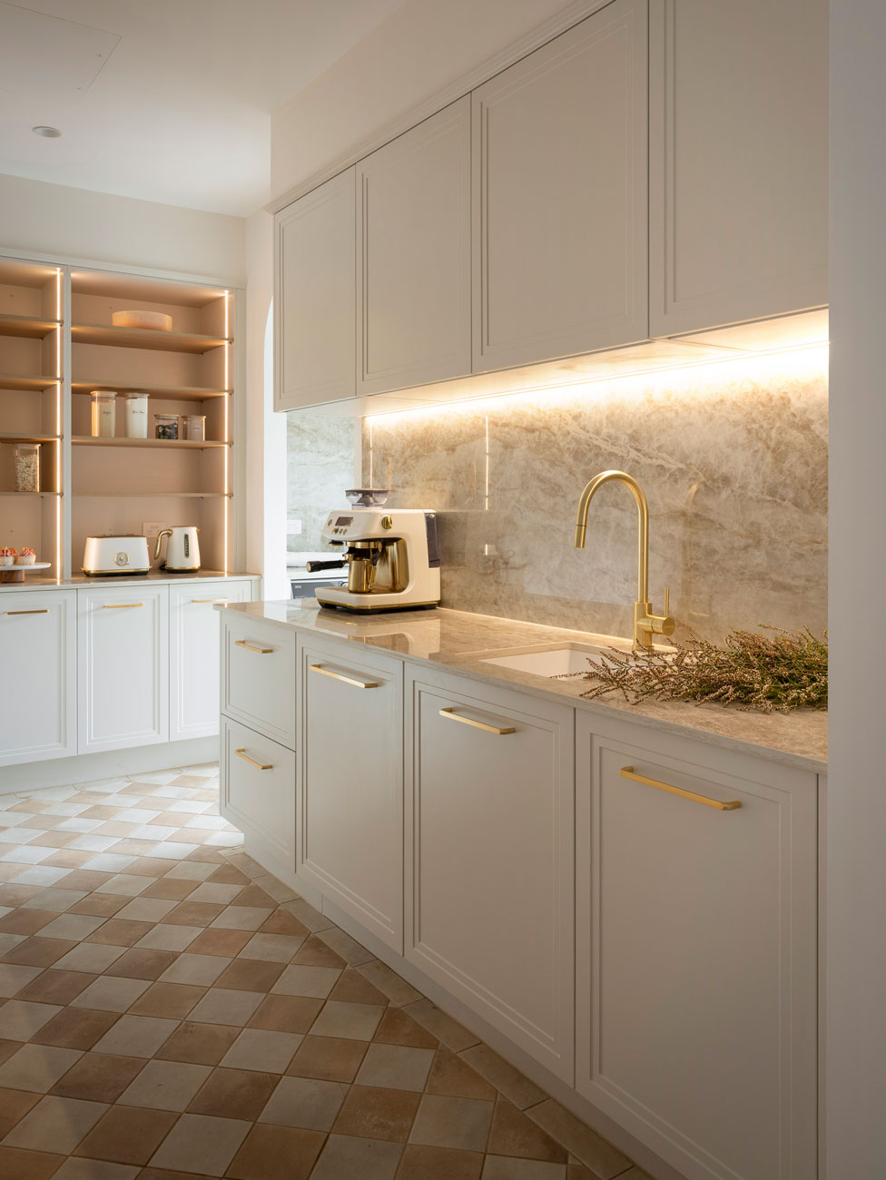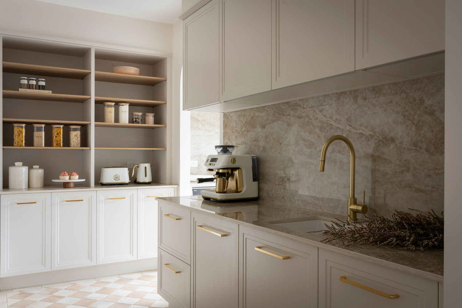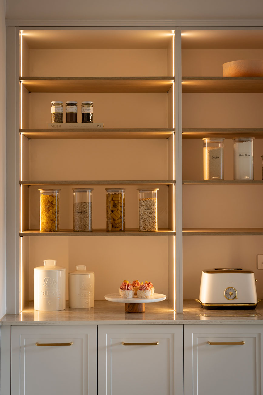 Functionality is at the forefront, with pull-out canvas laundry baskets, a hanging rail, and practical inclusions such as the Häfele quartz single bowl sink in white and gold goose neck mixer tap with pull-out sprayer. Warm LED strip and Flexi LED lighting highlights enhance the decorative cabinetry and open shelving, ensuring the space is as practical as it is visually cohesive.