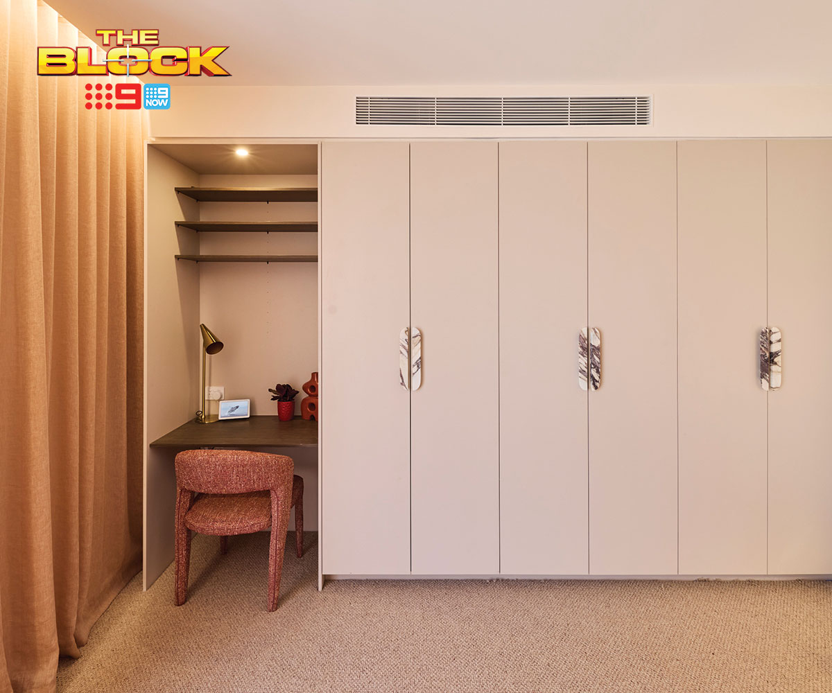 The Contestants chose to separate their Laundry space from the Pantry in their Layout, though thoughtfully considered the consistency of the palette to be warm, crisp and contemporary. The movement within the Dekton Taga benchtop ties this neutral subtle space together. The detail of added capping on top of the Esme profile doors, are a nod to farmhouse aesthetics, with a contemporary twist.