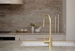Finishing details complete the look with a Häfele Double Undermount Quartz Sink in White and a Gold Gooseneck mixer tap with pull-out sprayer. The result is a chic and contemporary kitchen that is the heart of House 2.
