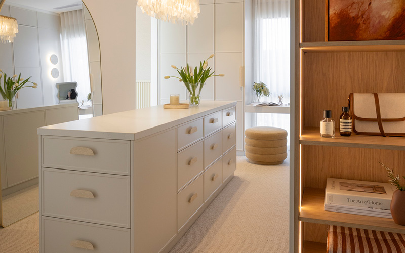 Britt and Taz’s winning L-shaped walk-in wardrobe combines elegant design with exceptional functionality. Framed by our new Linea Amaro Smooth wardrobe doors, the Nordic Oak Woodmatt interiors bring a warm, timeless feel to the space. The central island which is topped with Xeron Cascade Gold by Cosentino — provides generous wardrobe storage while serving as a stunning visual anchor. The Marble Ova Pull handles in Roman Travertine add subtle texture and natural warmth, while touch-catch cabinetry keeps the look sleek and uncluttered. Inside, the built-in wardrobe is fitted with premium wardrobe inserts to keep every item in order, from the Häfele Rotating Shoe Rack, to a Varano Hamper and Hettich safe drawer with fingerprint access. NEW Häfele LED Flexi Strip vertical lighting with sensors softly illuminates the interiors, ensuring both everyday ease and a sense of luxury. A dedicated makeup table completes this beautifully considered space, balancing style, comfort, and organisation.
