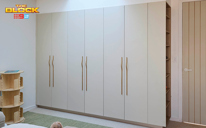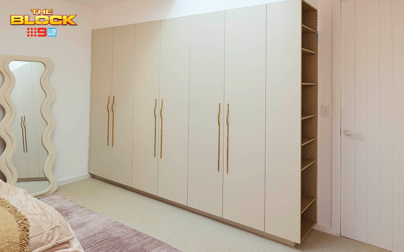 Britt and Taz’s winning built-in wardrobe design seamlessly blends the warm, inviting tones of Pale Almond Natural wardrobe doors with the earthy, rustic charm of Nordic Woodmatt internals—also featured on the open shelving at the side of the design.