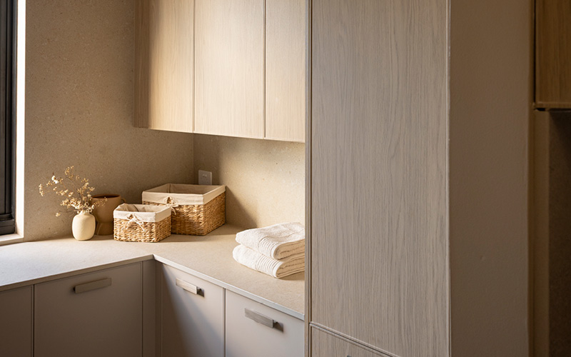 Britt and Taz designed their laundry as a stand-alone space, separate from the pantry, to give it its own sense of purpose. The cabinetry pairs Cora Winter Wheat Smooth with Caribou Oak, while Dekton Avorio benchtops and splashbacks by Cosentino provide a durable work surface. Finishes are completed with Touch Brushed Nickel Bar handles and Touch Catch, tying the design back to the rest of the home.