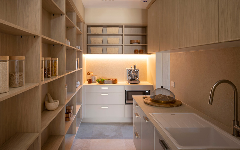 Designed to function as a secondary kitchen, the pantry offers generous storage and practical solutions for busy family living. Hettich AvanTech YOU drawers, cutlery trays with spice tray, knife block, and foil roll holder, plus non-slip mats and a Häfele Ninka pull-out bin, maximise organisation. Everyday tasks are supported by a white Häfele quartz sink and a stainless-steel goose neck tap with vege sprayer, with Warm LED strip lighting completing the highly functional layout.