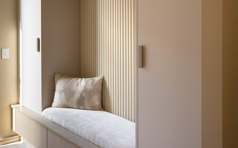 The addition of the sculptural Clear American Oak Wave Timber handles add interest to the design, opening to interiors that are illuminated by Häfele Sensor-activated Warm White Bar Lights. Within the robe, the wardrobe storage is plentiful, thanks to full and half hanging garment space, open shelves and soft-close drawers. The open shelving on the side of the robe is visible as you enter the room- adding the perfect place to style décor and add personality and colour.