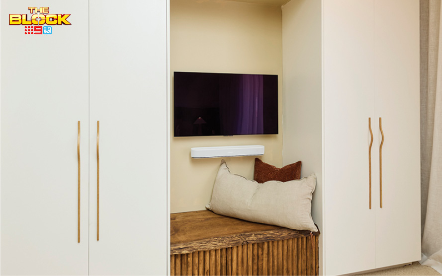 Their neutral colour palette continues with Cora Winter Wheat Smooth and Caribou Oak Woodmatt cabinetry, paired with Brushed Nickel Bar and Touch Catch handles for a clean, cohesive finish. A custom cushion and wall panelling by the contestants adds a personal touch, while Häfele warm LED down lights ensures the space is well lit and easy to use.