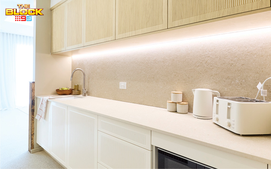 Britt and Taz delivered a standout kitchen design to tie for the win in one of the most coveted weeks on The Block – Kitchen Week! True to the light and bright aesthetic that defines their home, the kitchen is welcoming, refined, and full of thoughtful details that make it a true showstopper- a space designed to impress while still feeling inviting and comfortable. Contemporary shaker-style Cora kitchen cabinets are used throughout, pairing the soft tones of Winter Wheat with the rich woodgrain of Caribou Oak. Together, they create a timeless dual-tone palette, elevated by the sleek new Marco Bar handles in Brushed Nickel and minimalist Touch Catch hardware. The warmth of timber is balanced with the sophistication of stone, including the showstopping Dekton Nara by Cosentino on the kitchen island bench and splashback, complemented by Dekton Aeris on the rear benchtop. Designed with an open waterfall edge, the island bench provides generous seating space while anchoring the open-plan layout with a sense of flow and spaciousness. Behind the scenes, functionality is maximised with new Hettich AvanTech YOU Illuminated Drawers and Inner Drawers, Cutlery Trays with Knife Block and Foil Compartments, Non-Slip Mats, a Häfele Cooking Agent, and Ninka Bins. The White Häfele Quartz Sink and Stainless Steel Goose Neck Tap with Vege Sprayer add the finishing touches on this beautiful kitchen.