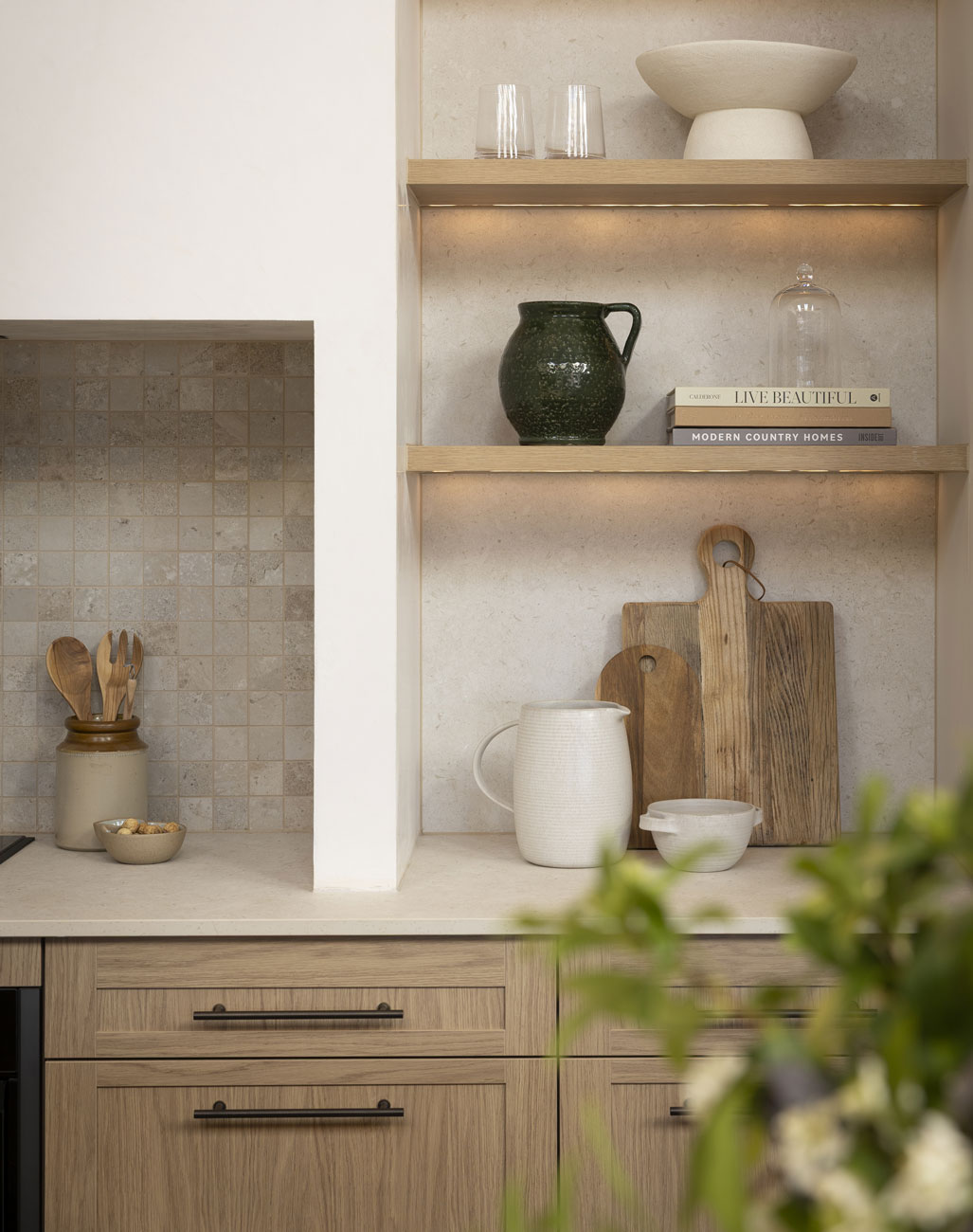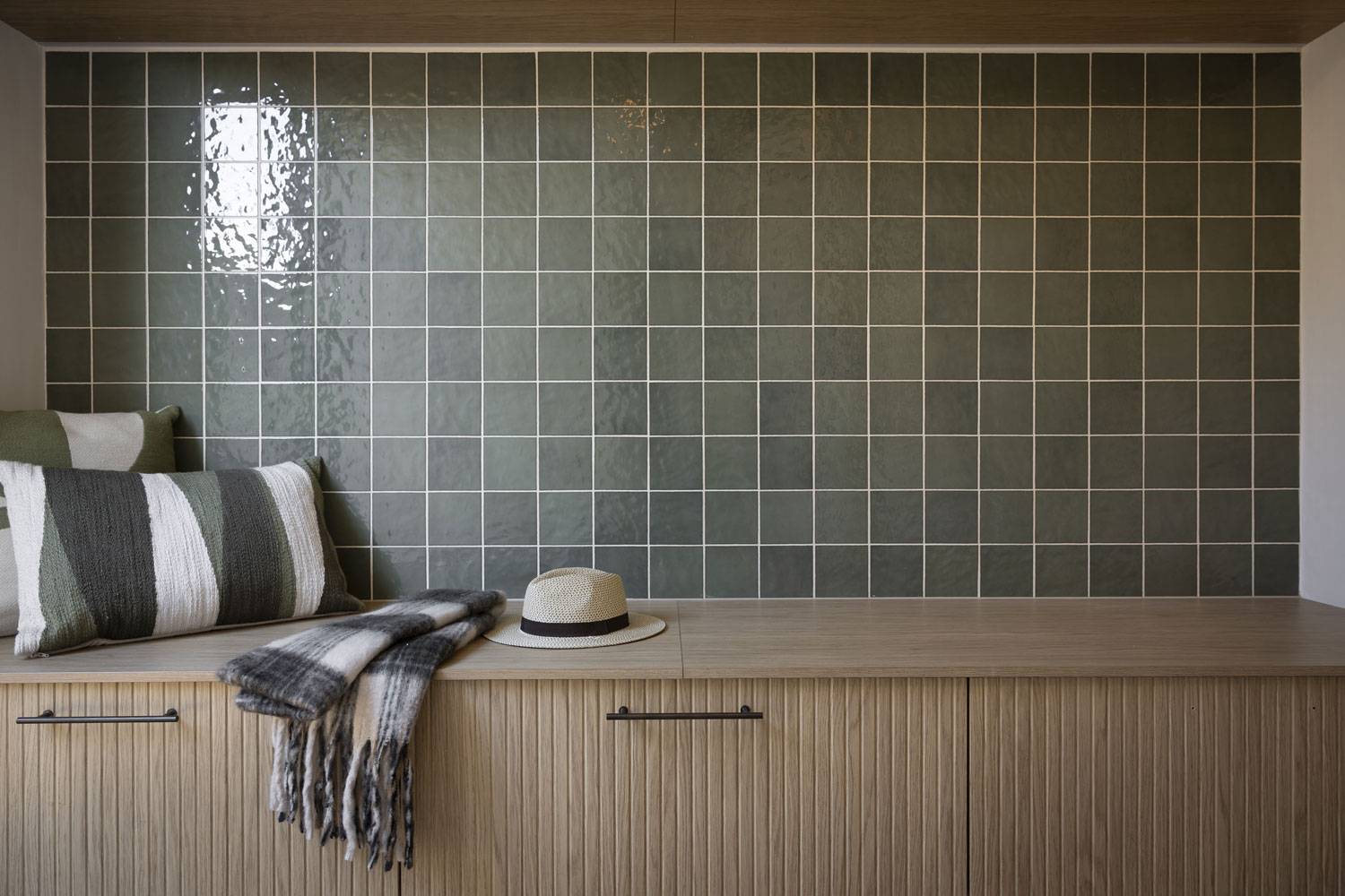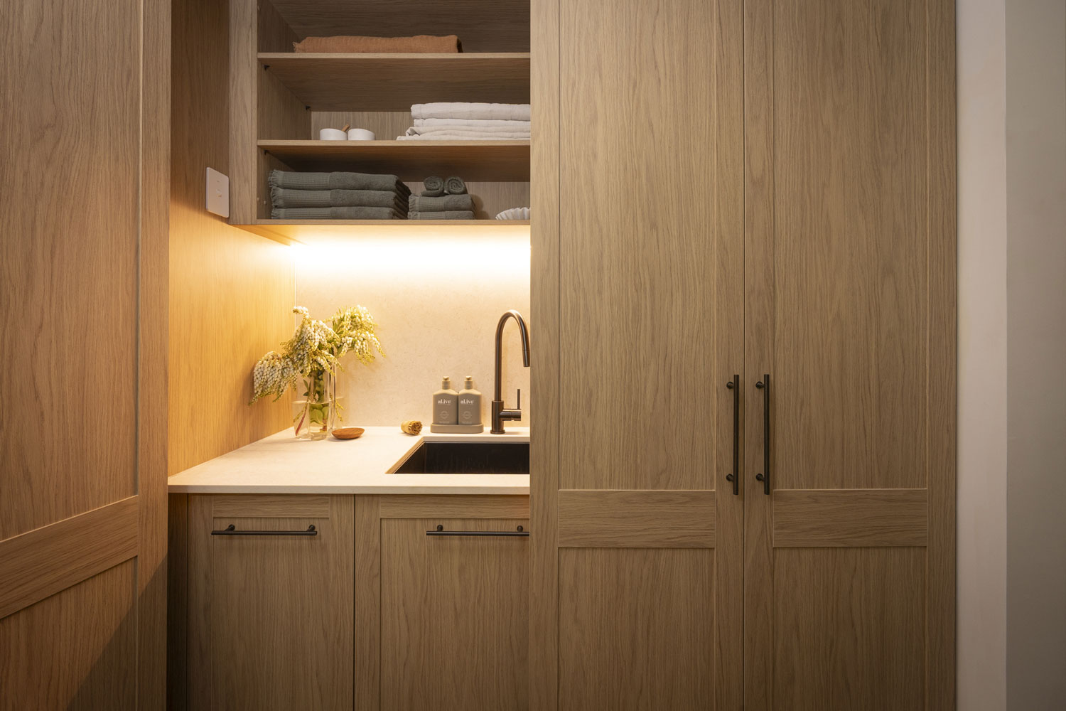 The Nordic Oak Woodmatt cabinetry continues the palette used throughout the home, providing a warm and cohesive backdrop. The ribbed Verity doors add texture and visual interest, giving the mudroom a unique touch. Touch Bronze Rail Pull handles with Touch-Catch and Häfele warm LED strip lighting complete the design, making the space practical and welcoming.