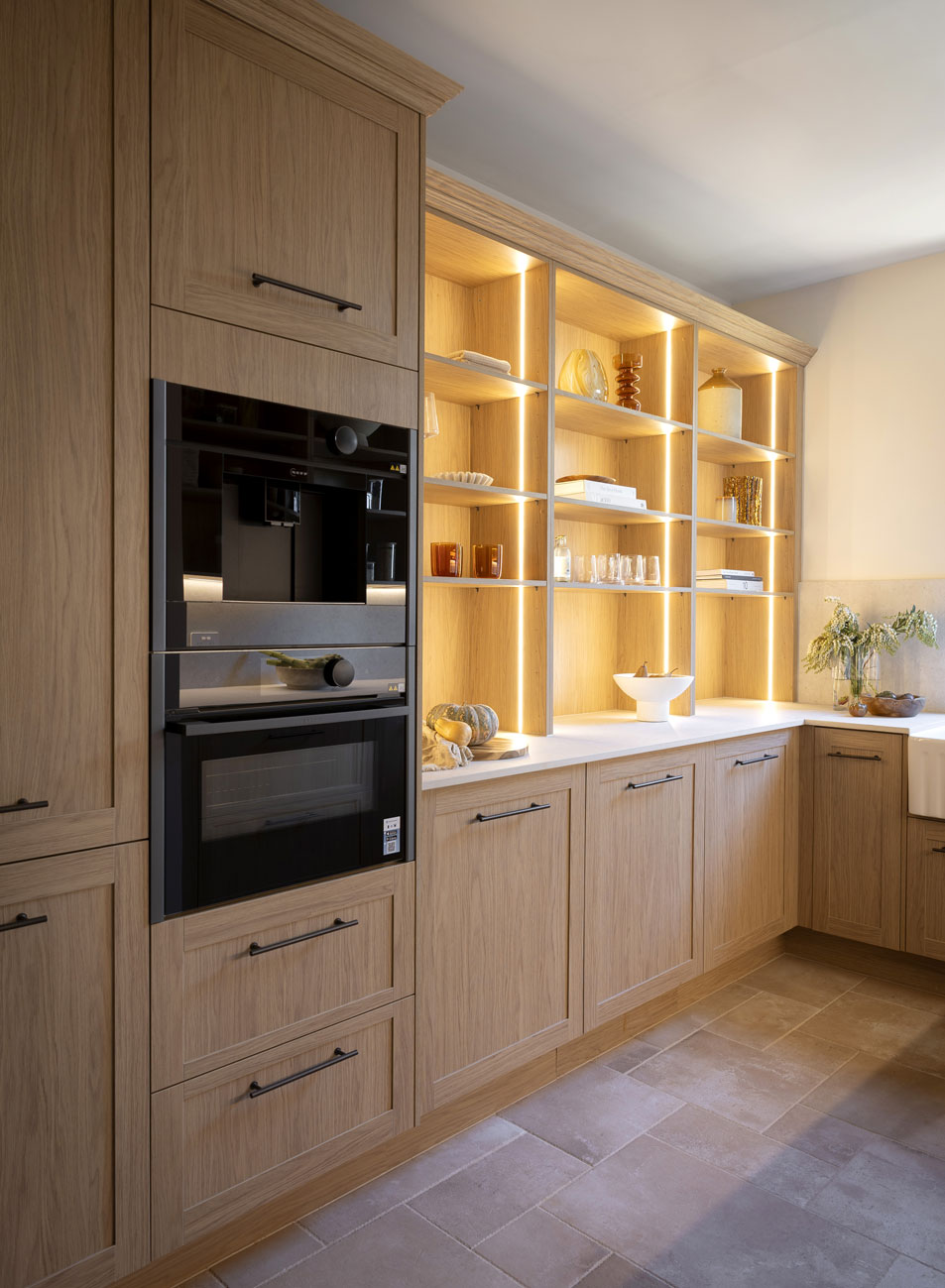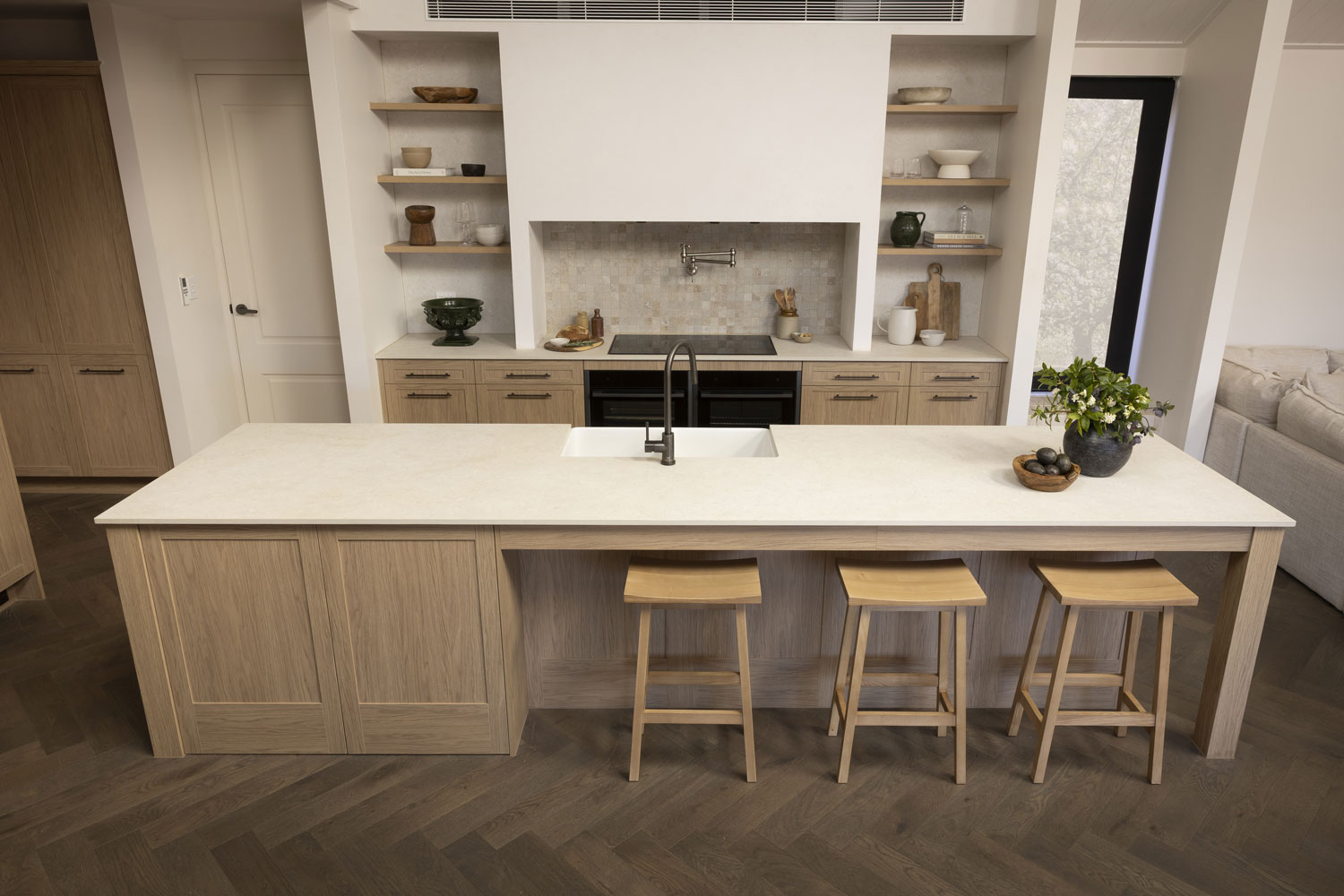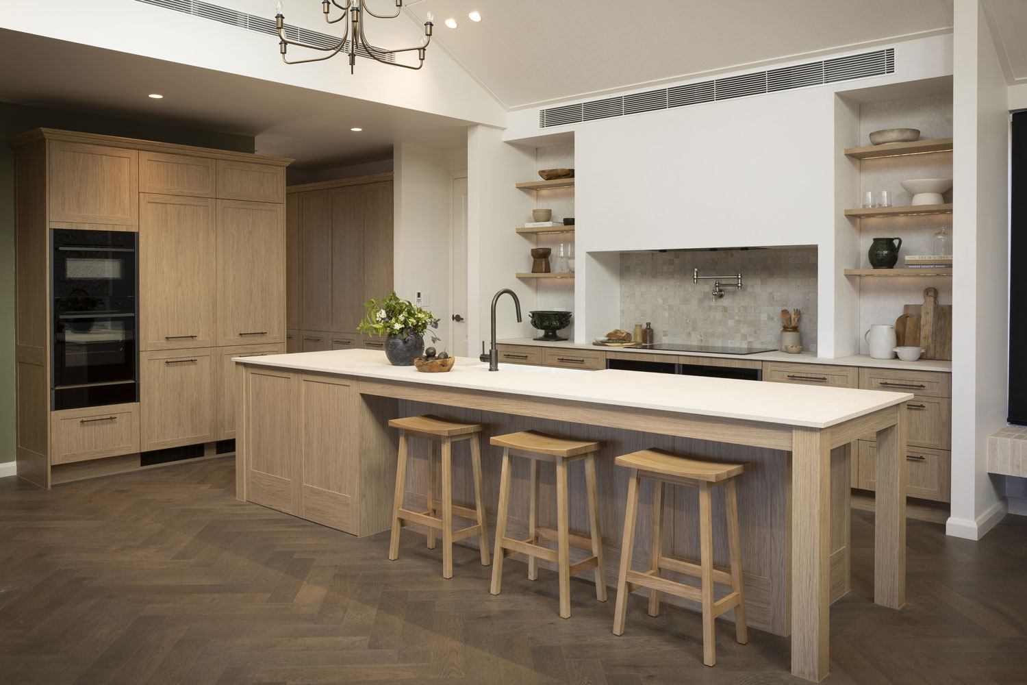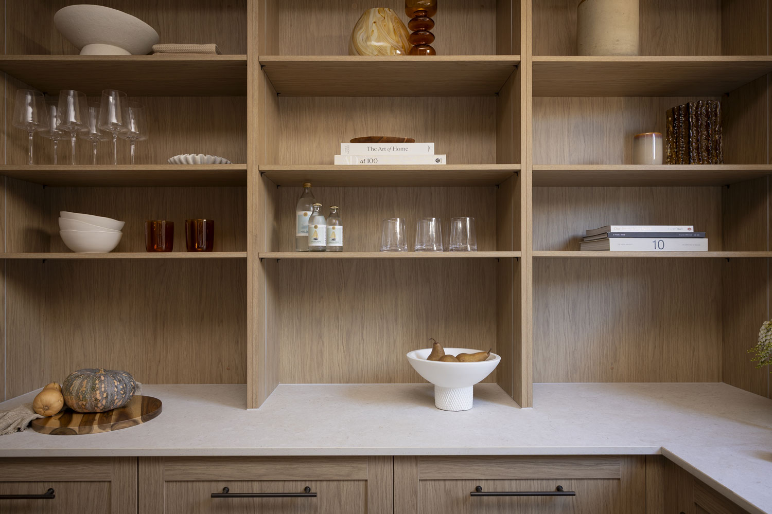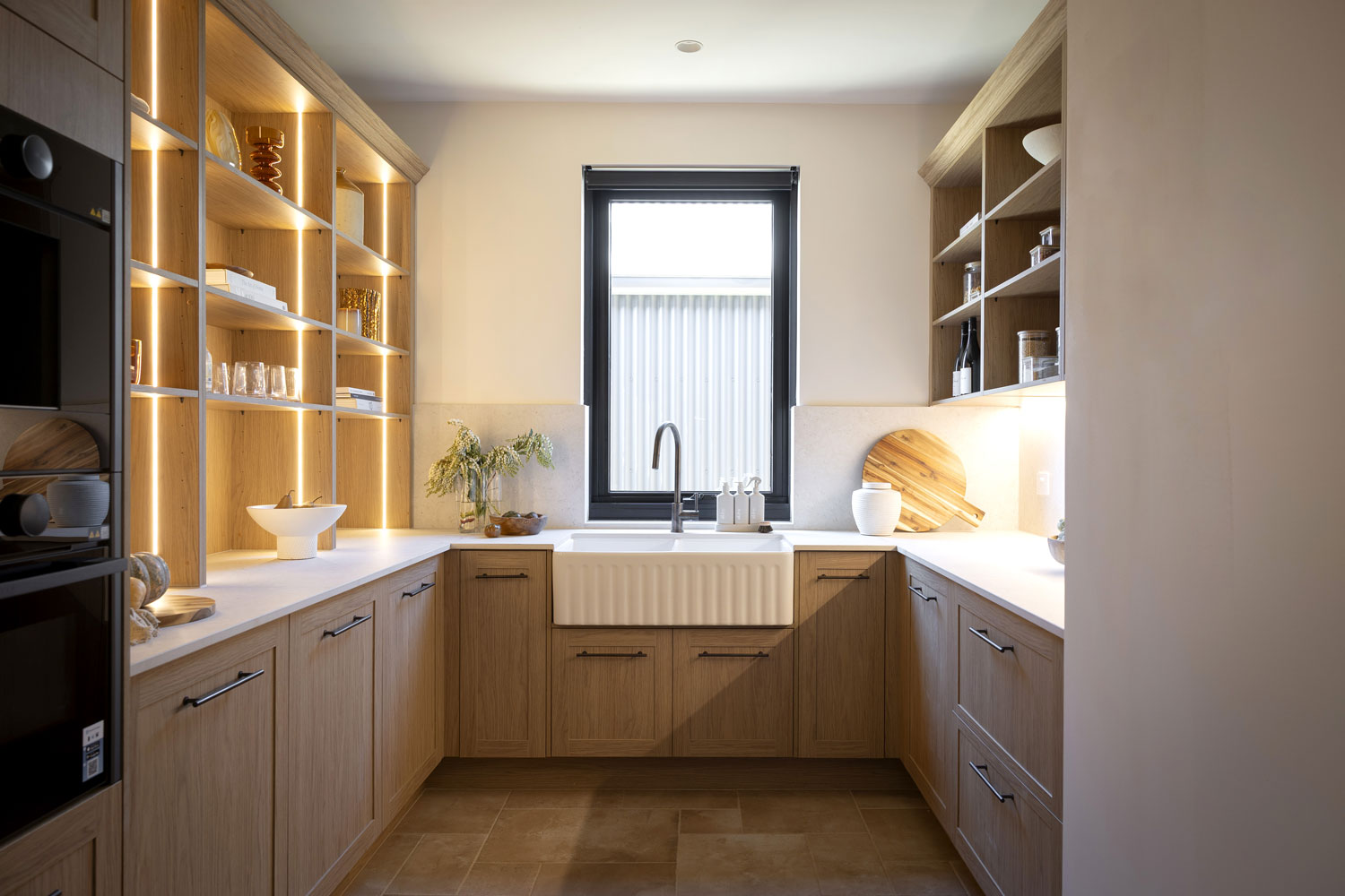 Robby and Mat presented a walk-in pantry designed for both style and functionality. The Sienna Nordic Oak Woodmatt cabinetry with Bronze Rail Pull handles provides a warm backdrop, beautifully highlighted with warm LED strip lighting. The combination of open shelving and closed cupboards creates a balanced design, allowing for both display and concealed storage. The look is complemented by Dekton Pietra Kode Nebu benchtops and splashbacks by Cosentino, which introduce subtle texture and depth.