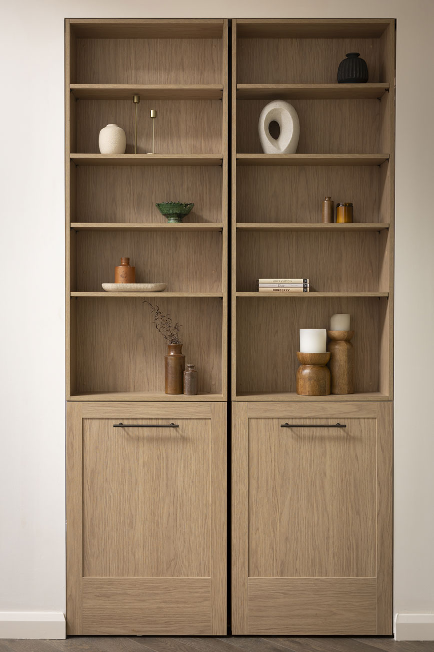 The wardrobe is elevated with the inclusion of statement Ova Pull handles in Brushed Gunmetal, which act as striking focal points against the timber tones. Inside, a thoughtful combination of hanging space, shelving, and Häfele Cassetti drawers, is complemented by Warm LED light bars with sensors, ensuring practicality and accessibility while maintaining a sleek, refined aesthetic.