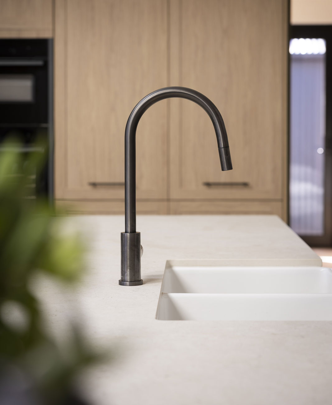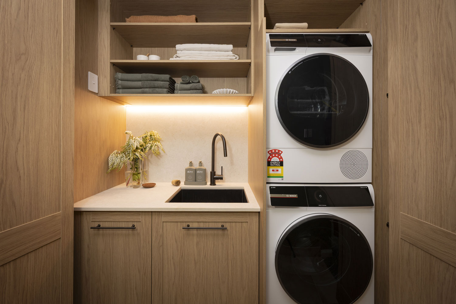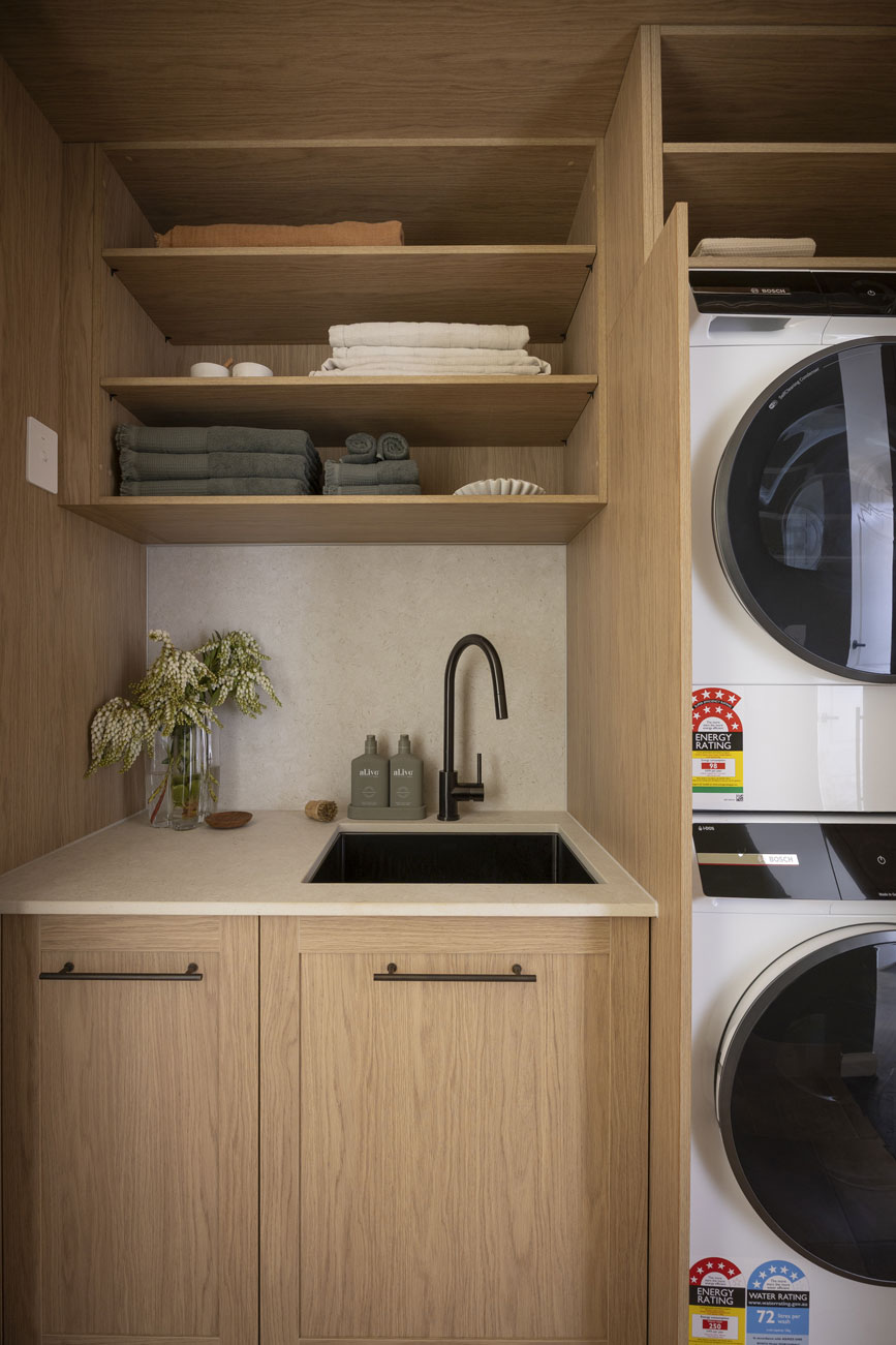 Robby and Mat positioned their laundry discreetly along the corridor, hidden behind bi-fold doors for a clean transition to the pantry. The space combines our new Shaker-style Sienna Nordic Oak Woodmatt doors with Touch Bronze Rail Pull handles, complemented by Dekton Pietra Kode Nebu benchtops and splashbacks by Cosentino for a subtle mix of texture and warmth. The laundry design is compact but efficient, with room for a stacked washer and dryer, bench space with a linen finish Häfele sink in Gun Metal, and wire laundry baskets for organised storage. A gooseneck tap with pull-out sprayer and Warm LED strip lighting complete the space, ensuring it’s practical, well-lit, and cohesive with the overall home design.