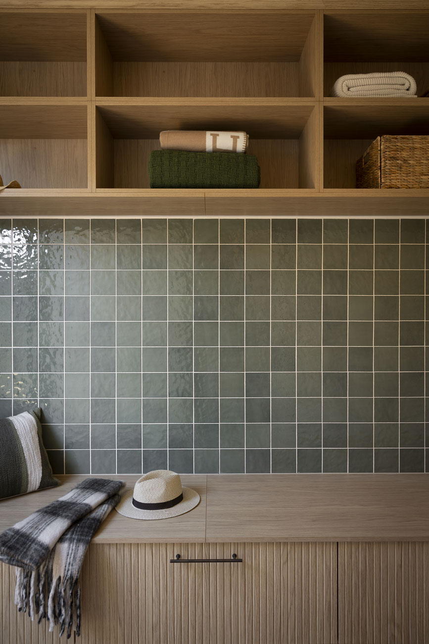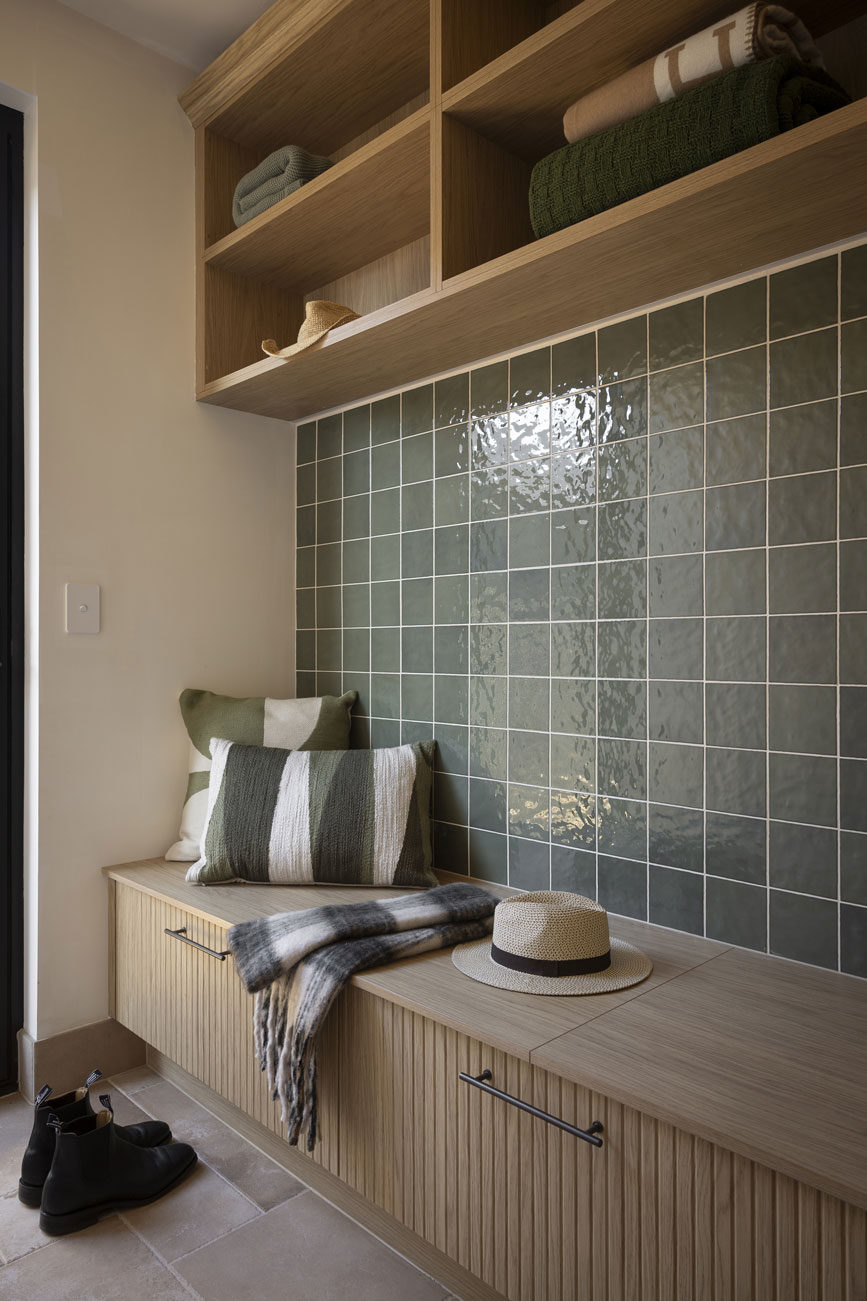 Robby and Mat’s mudroom combines simplicity with practicality, featuring a bench with drawers underneath for shoe storage and overhead open shelving for additional organisation. The layout allows easy access and keeps everyday items neatly tucked away, making the space functional without feeling cluttered.