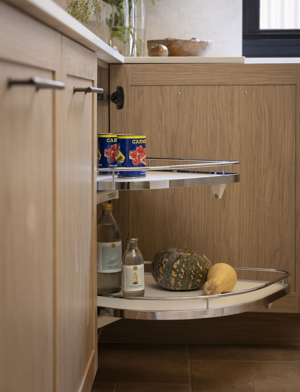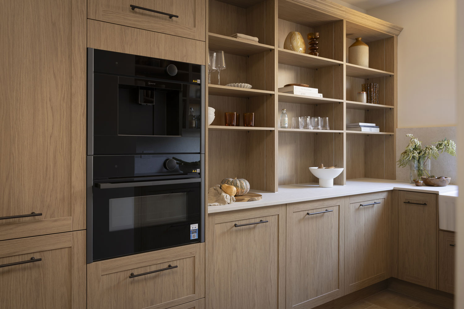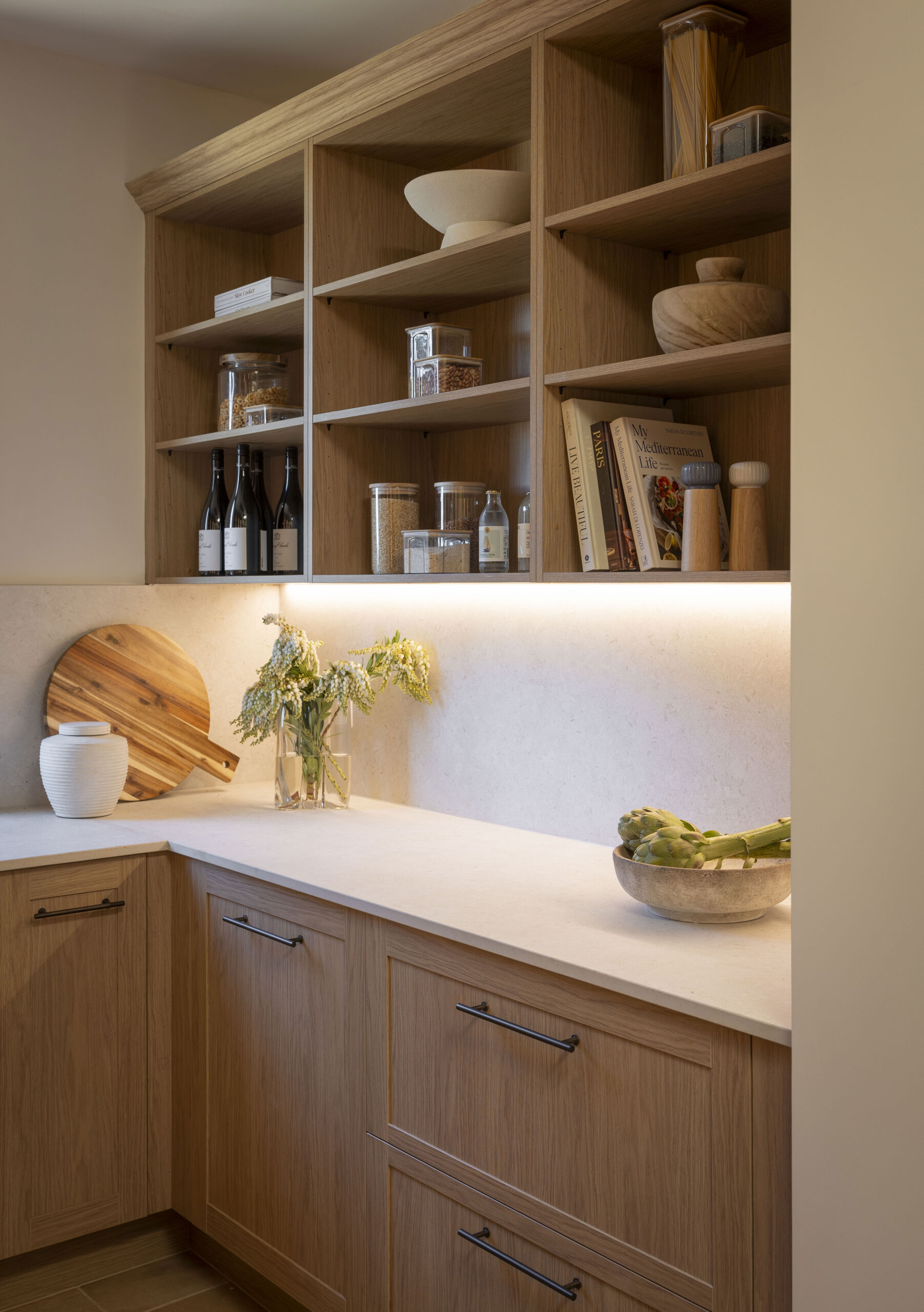 The layout maximises organisation with Hettich AvanTech drawers, cutlery trays with knife block and foil compartments, non-slip mats, and a Häfele Ninka pull-out bin. A linen finish Häfele sink in Gun Metal with matching gooseneck tap and pull-out sprayer adds functionality, while Flexi LED highlights ensure the space is bright and accessible. The combination of classic textures and thoughtful detailing makes this pantry both practical and visually cohesive.