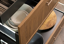 Accessories: NEW Hettich AvanTech YOU Drawers with Side Illumination, NEW Hettich Inner Drawers, NEW Hettich Cutlery Trays with Knife Block, Plate Carriers, and Foil Compartments, Häfele Ninka Bins, Häfele Tandem Side (to Broom Pantry), NEW Baking Tray Dividers (above Oven Tower)